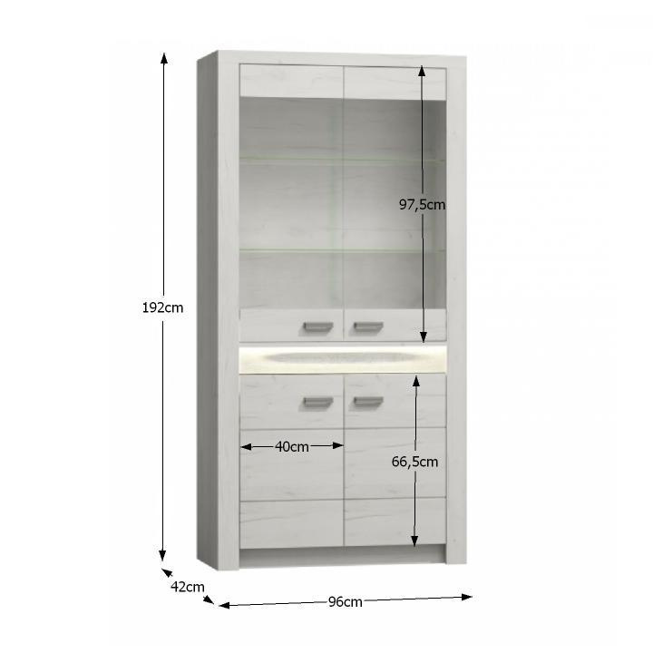 Materiál: DTD laminovaná/ABS hrany/MDF/sklo Barva: bílá Rozměry(ŠxHxV): 65x37x200,6 cm Tloušťka materiálu: 1,6 cm Výška nožiček: 16 cm Výška police: 29,8 cm Uzavřený úložný prostor S policemi Jeden šuplík ABS hrany Bez LED osvětlení Možnost dokoupení LED osvětlení Dodáván v demontu Hmotnost: 50.04kg