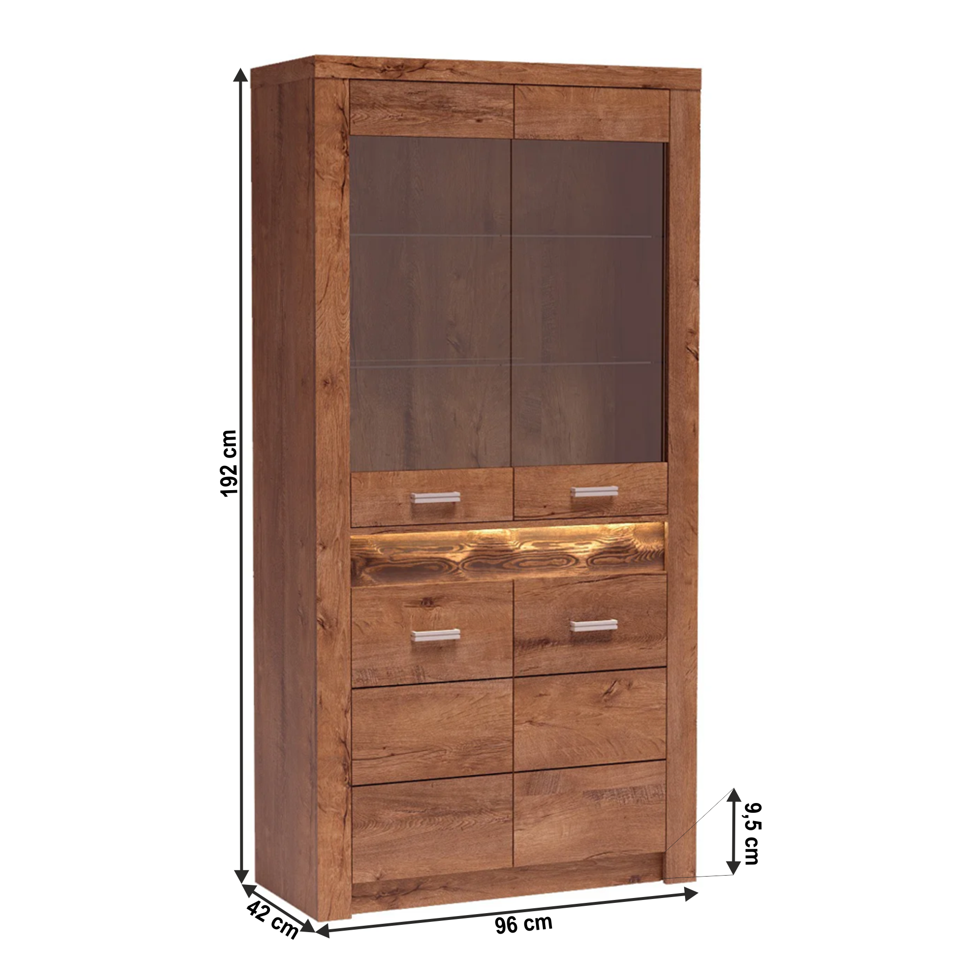 Vitrína Infinity I-03 Korpus hrubý až 48 mm, Tloušťka materiálu zbývající části: 16 mm, úchytky kovové Materiál DTD laminovaná, ABS hrany, Barevné provedení: jasan světlý Rozměry ŠxHxV: 96x42x192 cm. Možnost dokoupení LED osvětlení v ceně 890 Kč. Dodávané v demontu.