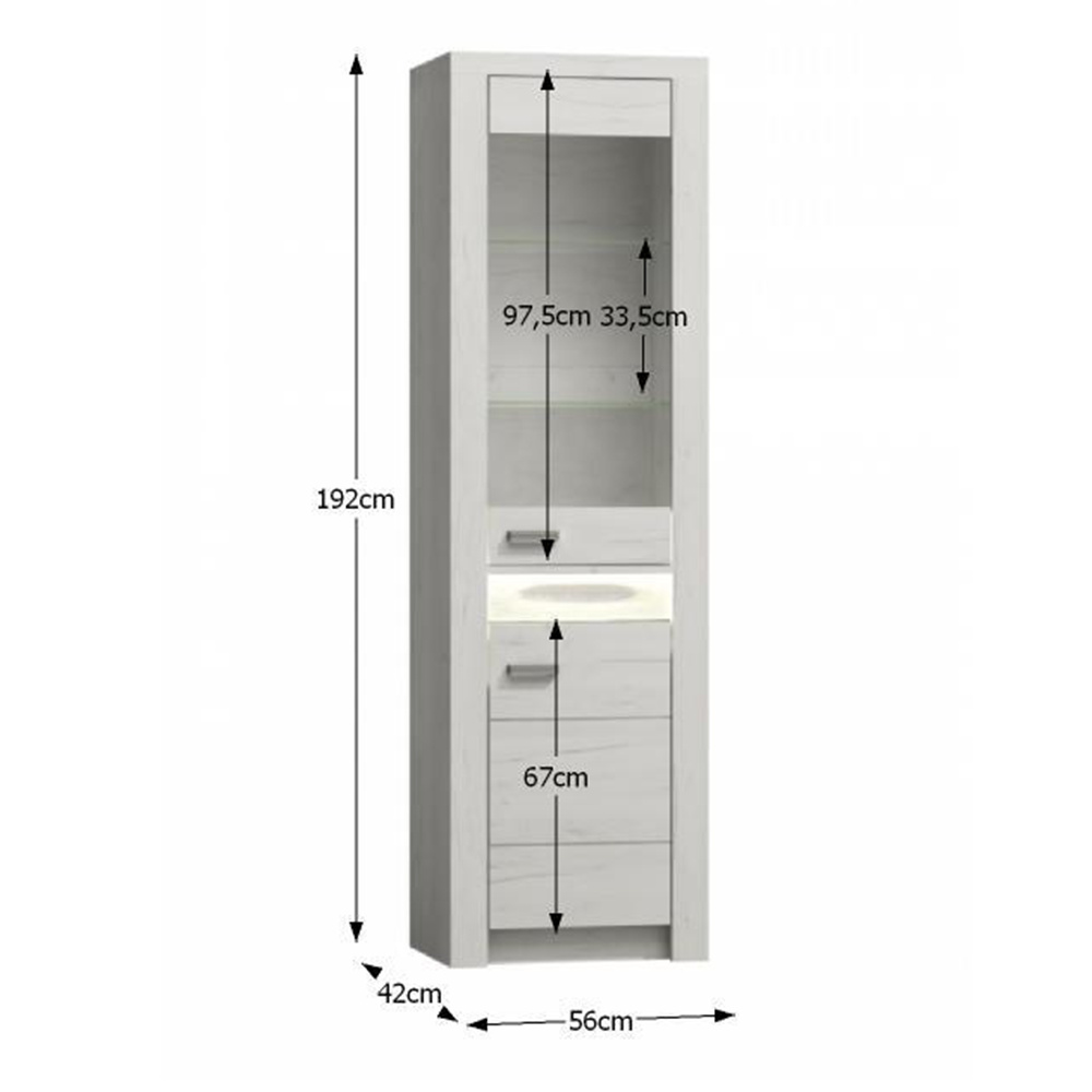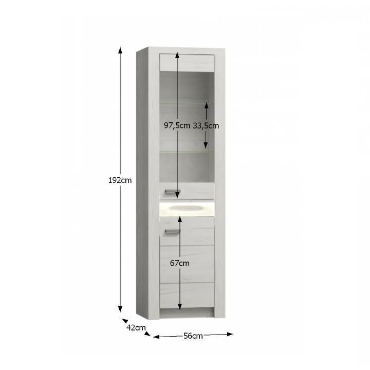Vitrína Infinity I-03 Korpus hrubý až 48 mm, Tloušťka materiálu zbývající části: 16 mm, úchytky kovové Materiál DTD laminovaná, ABS hrany, Barevné provedení: jasan bílý Rozměry ŠxHxV: 96x42x192 cm. Možnost dokoupení LED osvětlení v ceně 890 Kč. Dodávané v demontu. Hmotnost: 81.6kg
