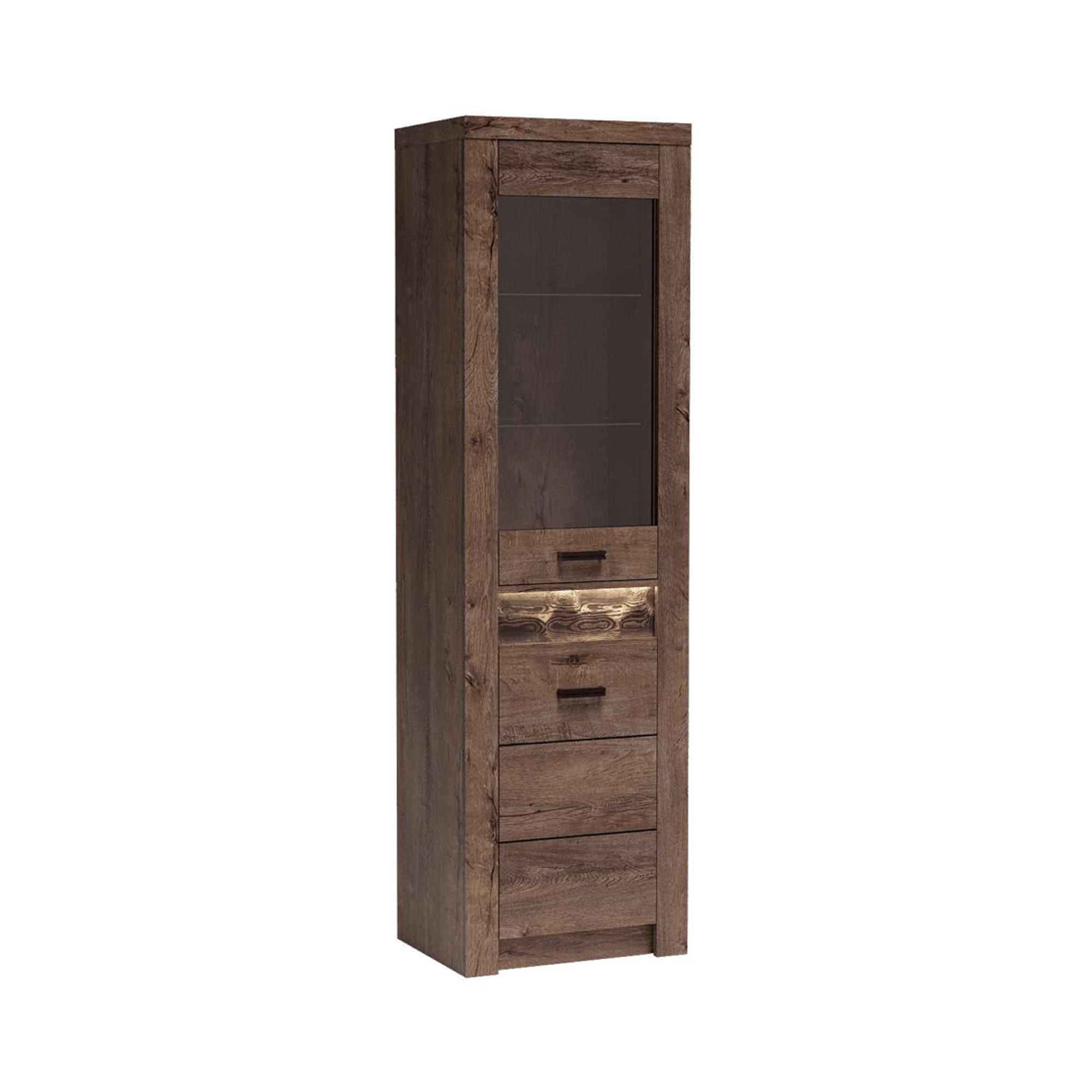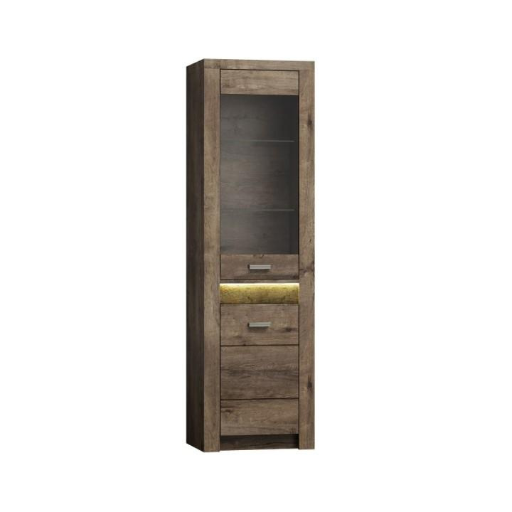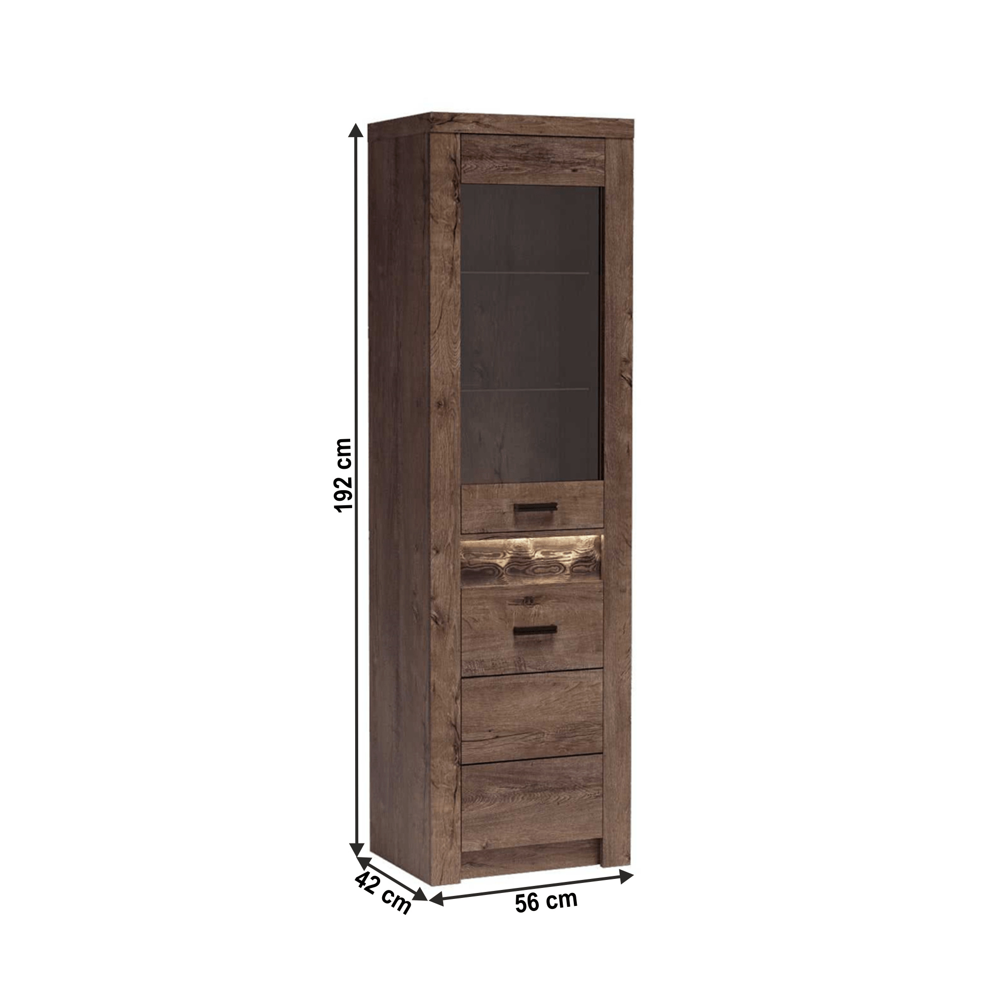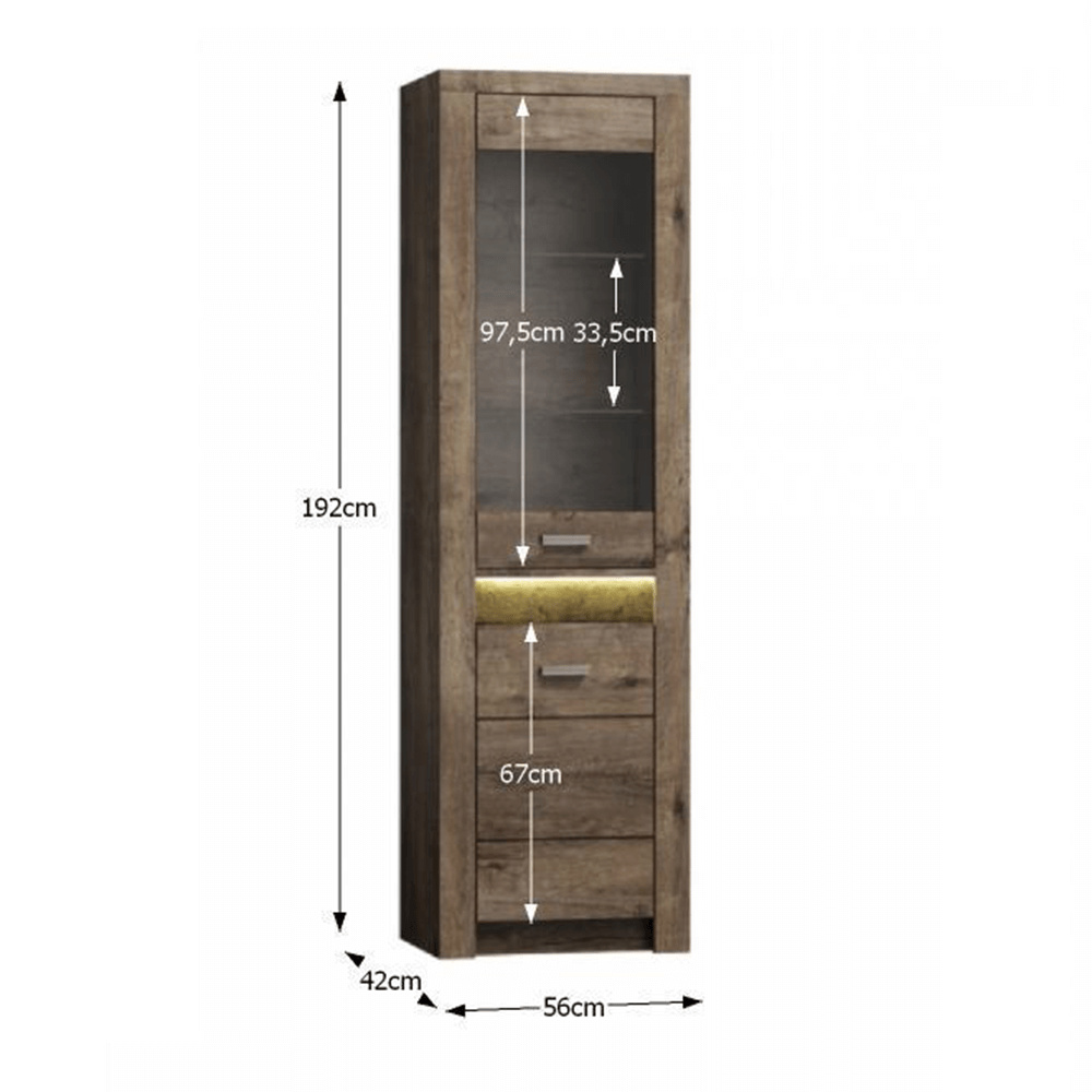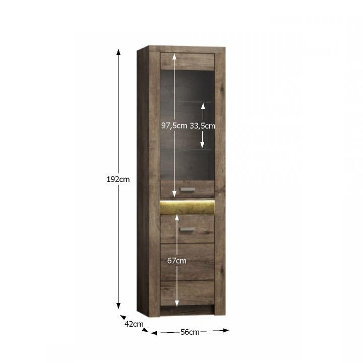 Vitrína 04 z luxusního sektorového nábytku. Korpus hrubý až 48 mm, Tloušťka materiálu: 48 mm Tloušťka materiálu zbývající části: 16 mm, úchytky kovové Materiál DTD laminovaná, ABS hrany, barevné provedení: jasan tmavý, Rozměry ŠxHxV: 56x42x192 cm. Možnost dokoupení LED osvětlení v ceně 770 Kč. Dodávané v demontu.