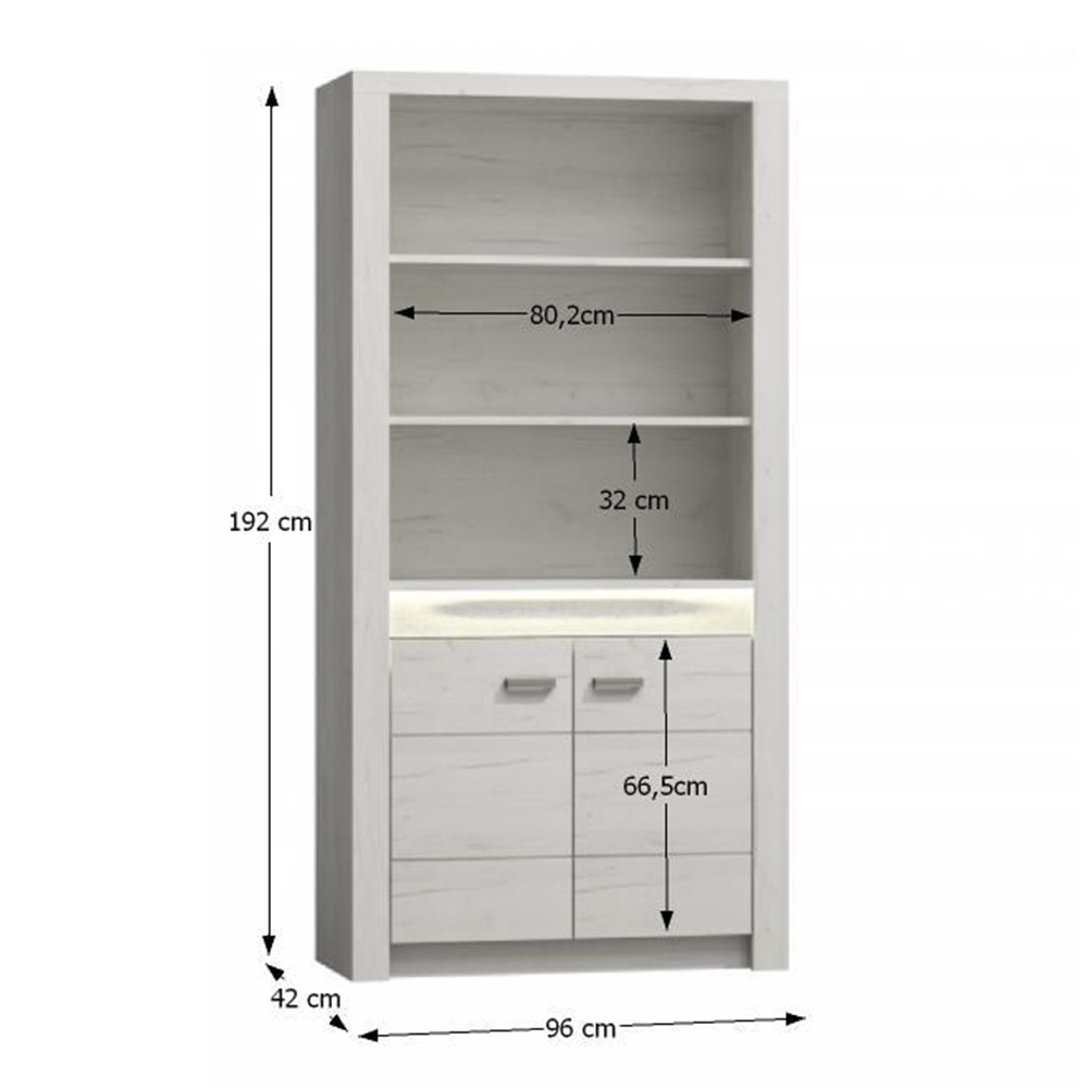 Regál I-05 Korpus hrubý až 48 mm, Tloušťka materiálu zbývající části: 16 mm, úchytky kovové Materiál DTD laminovaná, ABS hrany, Barevné provedení: jasan bílý, Rozměry ŠxHxV: 96x42x192 cm. Rozměry police (ŠxV): 80,2x32 cm Podsvícená deska z masivního dřeva Dodávané bez LED osvětlení Možnost dokoupení LED osvětlení v ceně 890 Kč. Dodávané v demontu.
