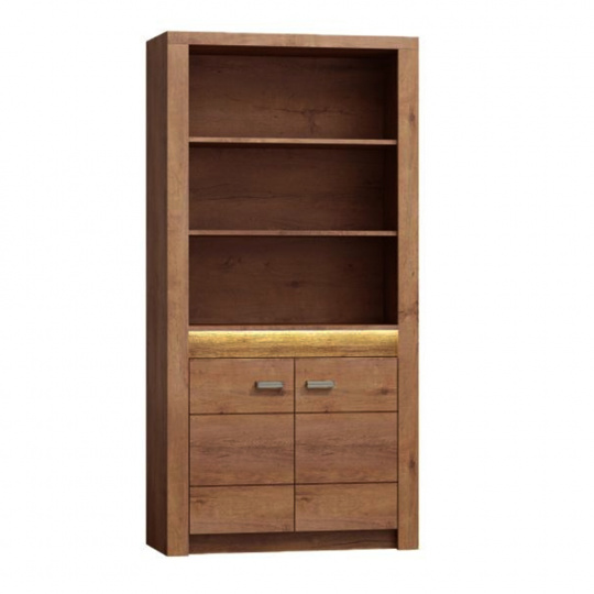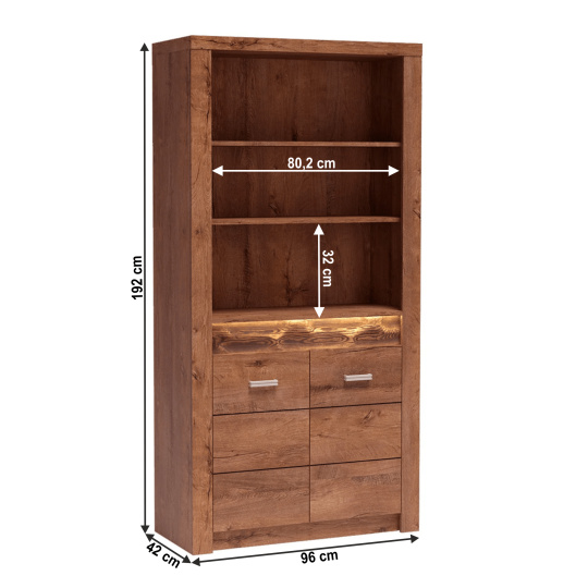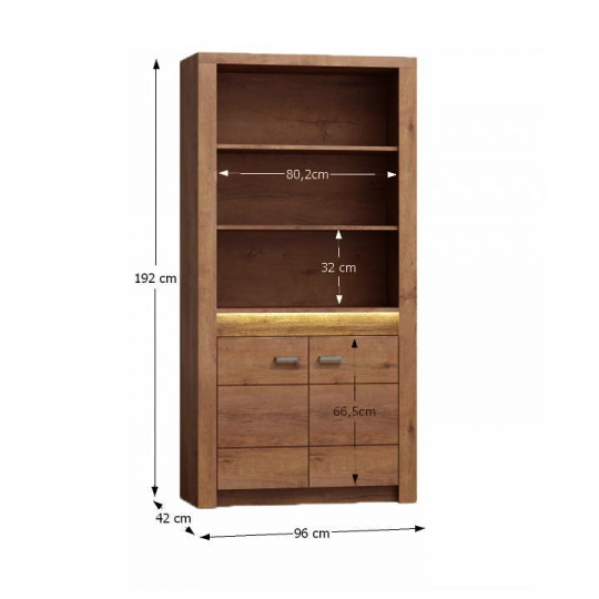 Regál I-05 Korpus hrubý až 48 mm, Tloušťka materiálu zbývající části: 16 mm, úchytky kovové Materiál DTD laminovaná, ABS hrany, Barevné provedení: jasan světlý, Rozměry ŠxHxV: 96x42x192 cm. Rozměry police (ŠxV): 80,2x32 cm Podsvícená deska z masivního dřeva Dodávané bez LED osvětlení Možnost dokoupení LED osvětlení v ceně 960Kč. Dodávané v demontu.