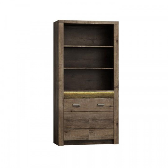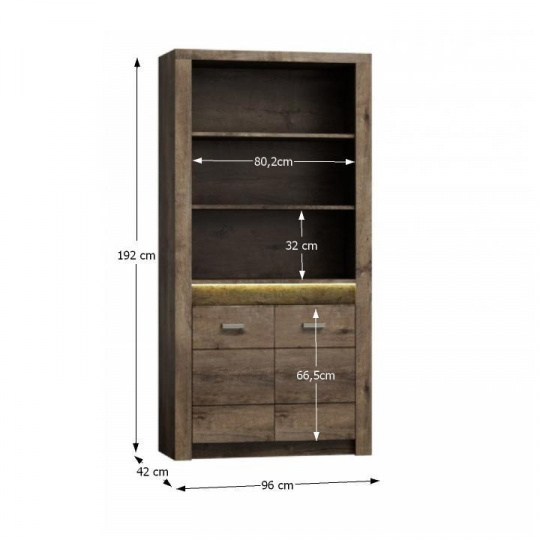 Regál I-05 Korpus hrubý až 48 mm, Tloušťka materiálu: 48 mm Tloušťka materiálu zbývající části: 16 mm, úchytky kovové Materiál DTD laminovaná, ABS hrany, Barevné provedení: jasan tmavý, Rozměry ŠxHxV: 96x42x192 cm. Rozměry police (ŠxV): 80,2x32 cm Podsvícená deska z masivního dřeva Dodávané bez LED osvětlení Možnost dokoupení LED osvětlení v ceně 890 Kč. Dodávané v demontu.