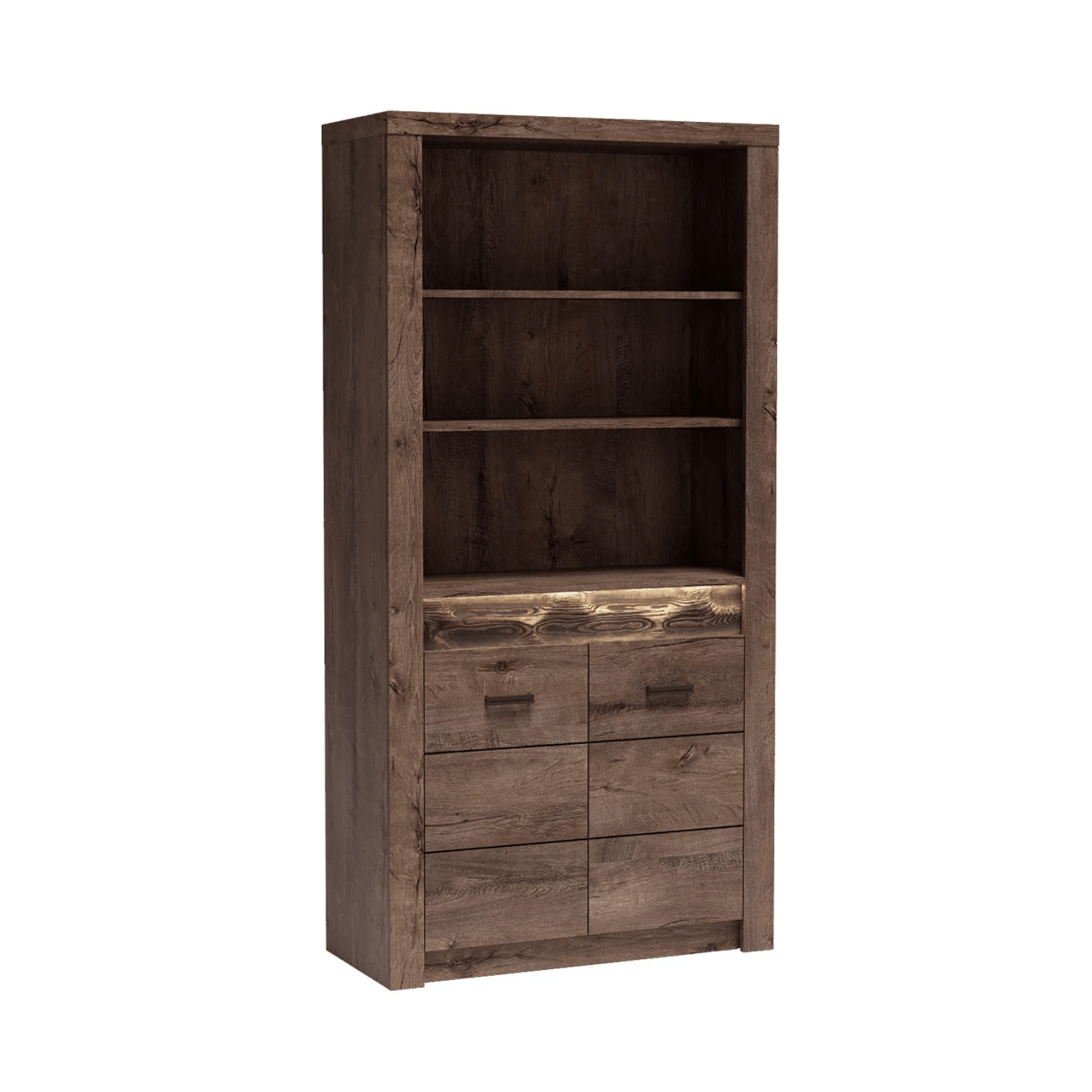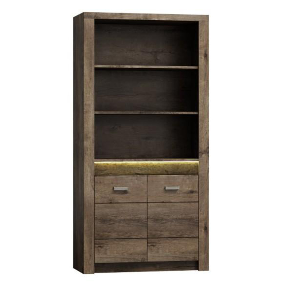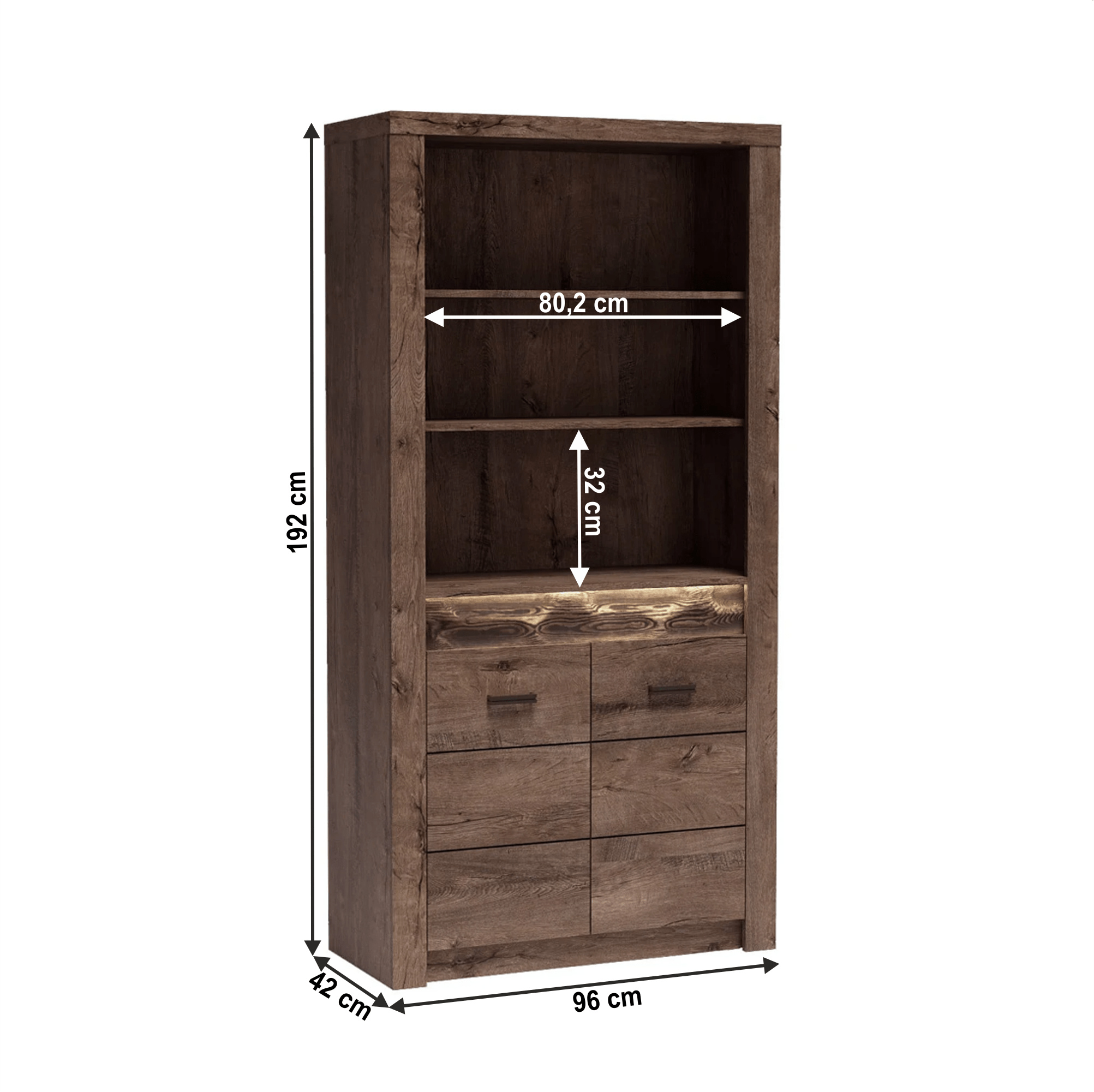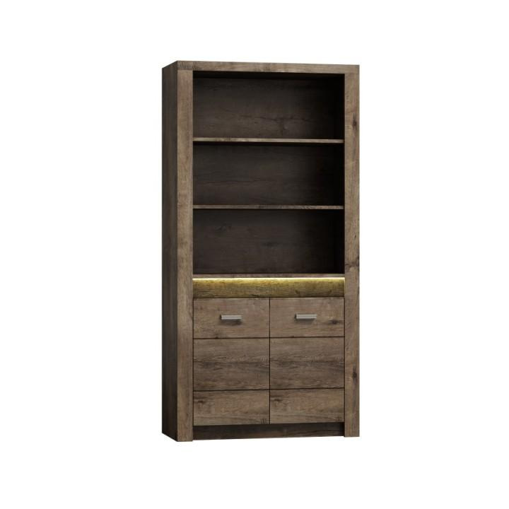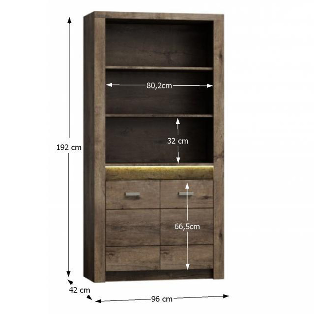 Regál I-05 Korpus hrubý až 48 mm, Tloušťka materiálu: 48 mm Tloušťka materiálu zbývající části: 16 mm, úchytky kovové Materiál DTD laminovaná, ABS hrany, Barevné provedení: jasan tmavý, Rozměry ŠxHxV: 96x42x192 cm. Rozměry police (ŠxV): 80,2x32 cm Podsvícená deska z masivního dřeva Dodávané bez LED osvětlení Možnost dokoupení LED osvětlení v ceně 890 Kč. Dodávané v demontu.