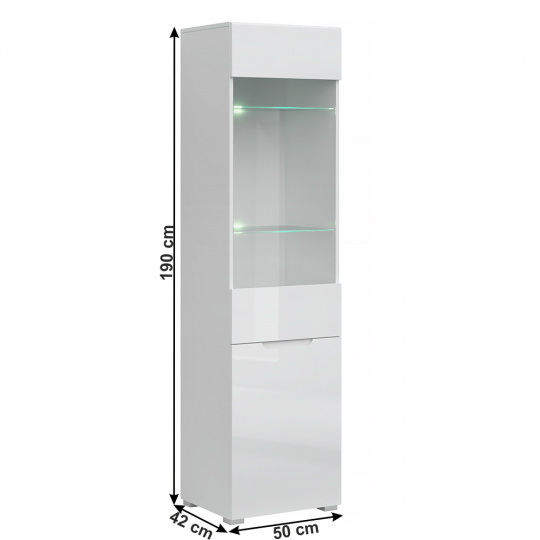 Materiál korpus: DTD laminovaná Rozměry (ŠxHxV): 50x42,8x190 cm Barva: bílá Materiál dvířka: MDF / sklo Barva: bílý extra vysoký lesk HG Tloušťka materiálu korpus: 16 cm Tloušťka materiálu dvířka: 18 cm Dodávané bez LED osvětlení Univerzální provedení dvířek L / P moderní styl Dodávané v demontu
