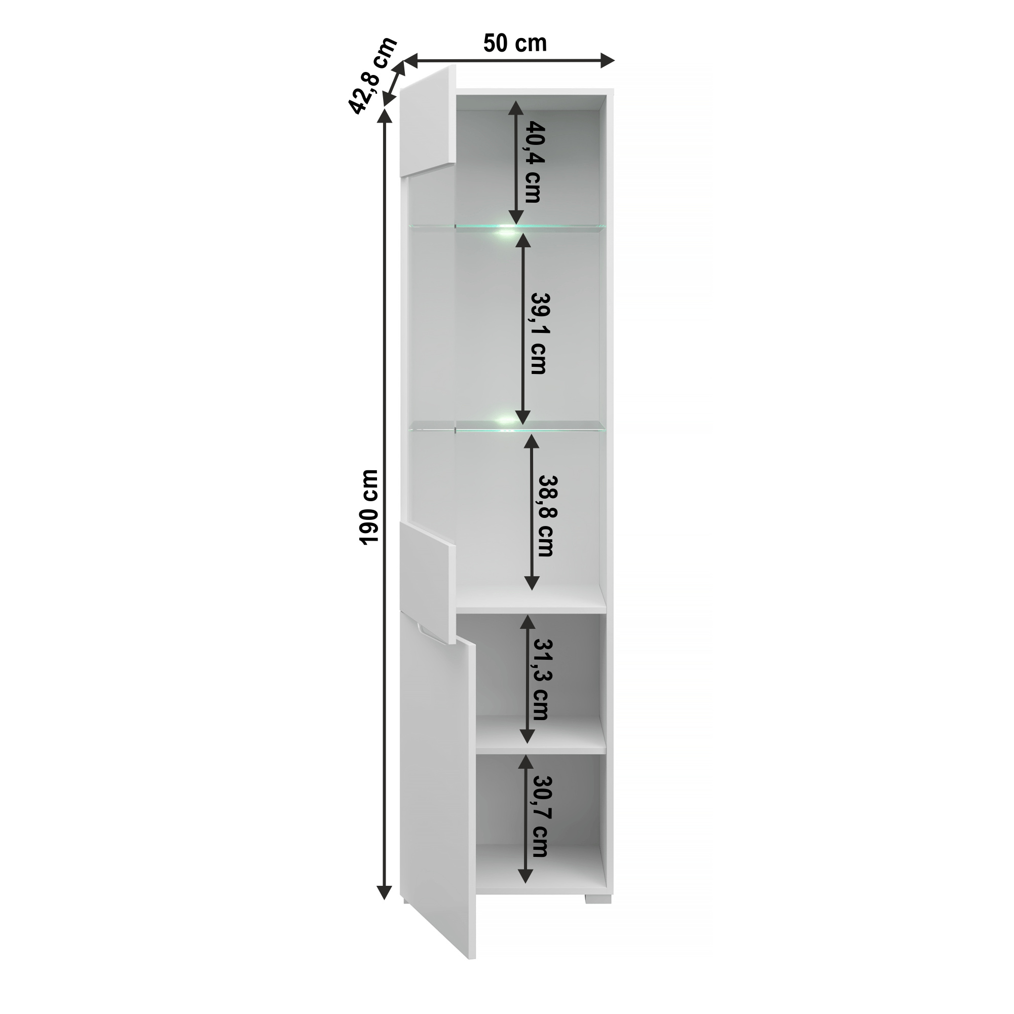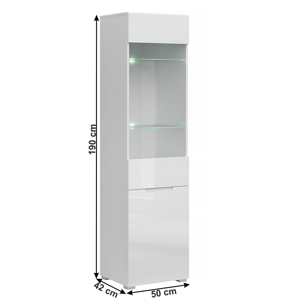 Materiál korpus: DTD laminovaná Rozměry (ŠxHxV): 50x42,8x190 cm Barva: bílá Materiál dvířka: MDF / sklo Barva: bílý extra vysoký lesk HG Tloušťka materiálu korpus: 16 cm Tloušťka materiálu dvířka: 18 cm Dodávané bez LED osvětlení Univerzální provedení dvířek L / P moderní styl Dodávané v demontu
