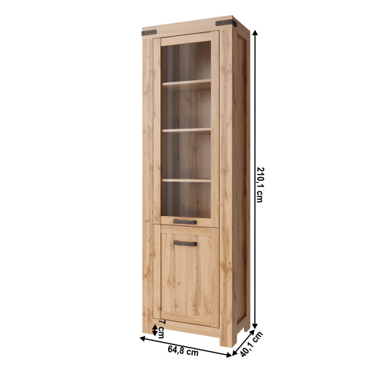 Materiál: DTD laminovaná/MDF/plast/sklo Barva: dub wotan Rozměry (ŠxHxV): 64,8x40,1x210,1 cm Výška nožiček 7 cm Tloušťka materiálu: 1,6 - 2,2 cm Jednodveřová Obsahuje skříňku a vitrínu Ve skříňce a ve vitríně jsou police Plastový dekor a úchytky MDF dvířka Dodávána v demontu