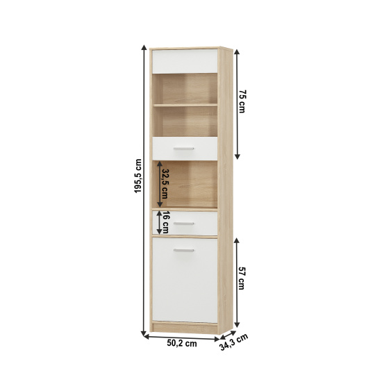 Vitrína 1D1W1S TEYO Materiál: DTD laminovaná Barva: bílá / dub sonoma Rozměry (ŠxHxV): 50,2x 34,3x195 cm Tloušťka materiálu: 16 mm Dodávané v demontu.
