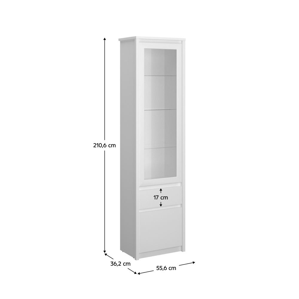 Materiál: DTD laminovaná/ABS hrany/sklo Barva: bílá Rozměry (ŠxHxV): 55,6x36,2x210,6 cm Tloušťka materiálu: 1,6-3,2 cm Skříňka s dvířky Šuplík Výška šuplíku: 17 cm Obsahuje dvířka se sklem Skleněné police Nosnost skleněné police: 3 kg Plastové nožičky Moderní design Doporučujeme připevnit ke zdi Dodáváno v demontu