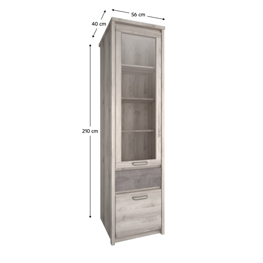 Materiál: DTD laminovaná Barva: kaštan nairobi/onyx Rozměry (ŠxHxV): 56x40x210 cm Tloušťka materiálu: 1,6-3,2 cm Kovové úchytky Barva úchytek: černá Vitrína Se sklem Policová Dvoudveřová Jeden šuplík Nosnost šuplíku: 5 kg Plastové nožičky Moderní design Doporučujeme připevnit ke zdi Dodáváno v demontu