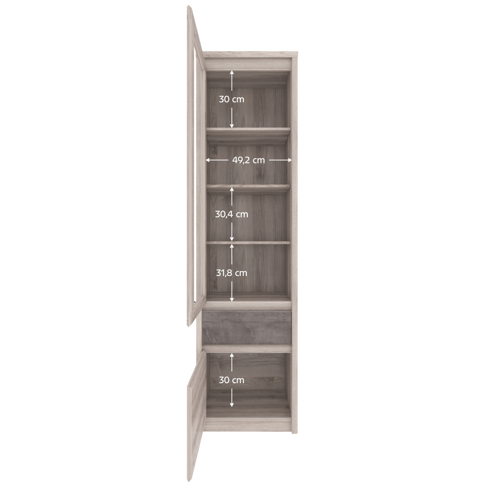 Materiál: DTD laminovaná Barva: kaštan nairobi/onyx Rozměry (ŠxHxV): 56x40x210 cm Tloušťka materiálu: 1,6-3,2 cm Kovové úchytky Barva úchytek: černá Vitrína Se sklem Policová Dvoudveřová Jeden šuplík Nosnost šuplíku: 5 kg Plastové nožičky Moderní design Doporučujeme připevnit ke zdi Dodáváno v demontu