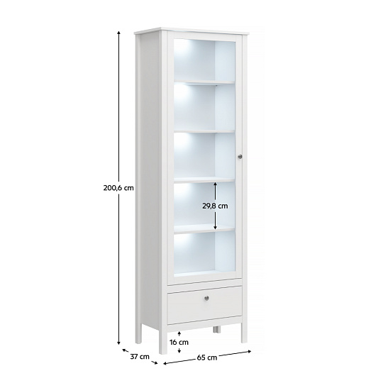 Materiál: DTD laminovaná/ABS hrany/MDF/sklo Barva: bílá Rozměry(ŠxHxV): 65x37x200,6 cm Tloušťka materiálu: 1,6 cm Výška nožiček: 16 cm Výška police: 29,8 cm Uzavřený úložný prostor S policemi Jeden šuplík ABS hrany Bez LED osvětlení Možnost dokoupení LED osvětlení Dodáván v demontu