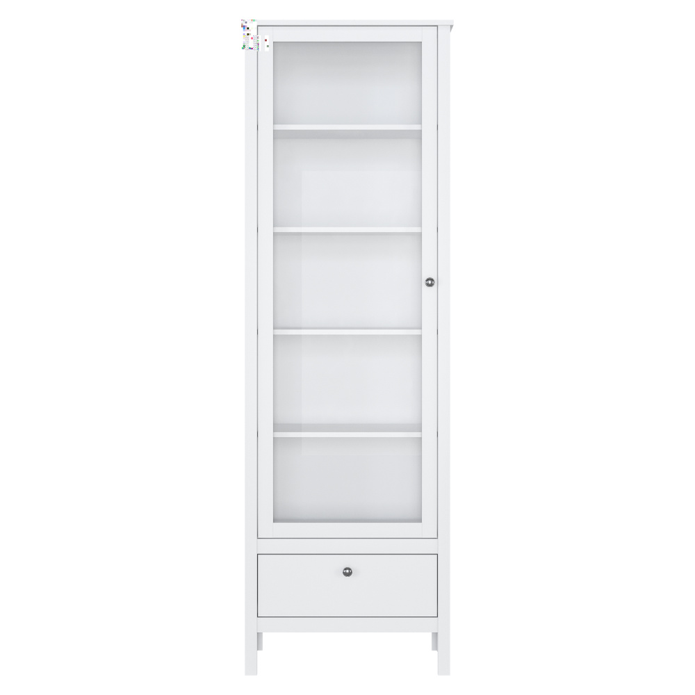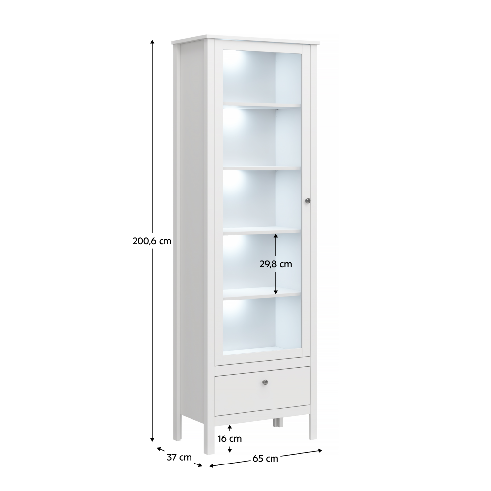 Materiál: DTD laminovaná/ABS hrany/MDF/sklo Barva: bílá Rozměry(ŠxHxV): 65x37x200,6 cm Tloušťka materiálu: 1,6 cm Výška nožiček: 16 cm Výška police: 29,8 cm Uzavřený úložný prostor S policemi Jeden šuplík ABS hrany Bez LED osvětlení Možnost dokoupení LED osvětlení Dodáván v demontu
