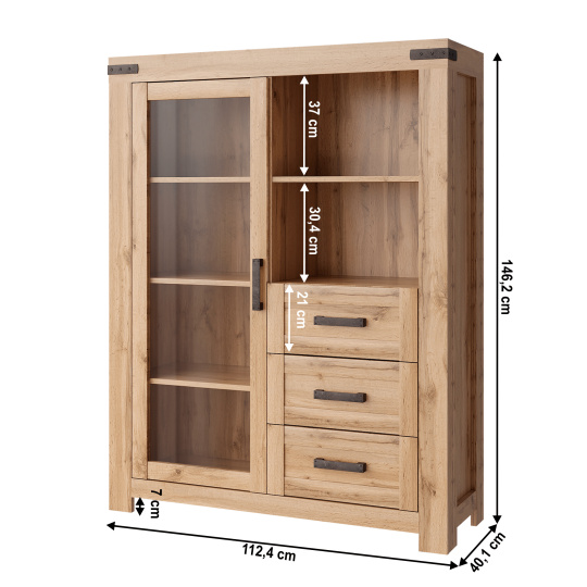 Materiál: DTD laminovaná/MDF/ABS hrany/plast/sklo Farba: dub wotan Rozmery (ŠxHxV): 112,4x40,1x146,2 cm Výška nožičiek 7 cm Hrúbka materiálu: 1,6 - 2,2 cm Kombinovaná Jednodverová Jedna vitrína s policami Tri šuplíky Otvorený úložný priestor s policou Výška šuplíkov: 21 cm Výška prvej police: 37 cm Výška druhej police: 30,4 cm Plastový dekór a úchytky Dodávaná v demonte