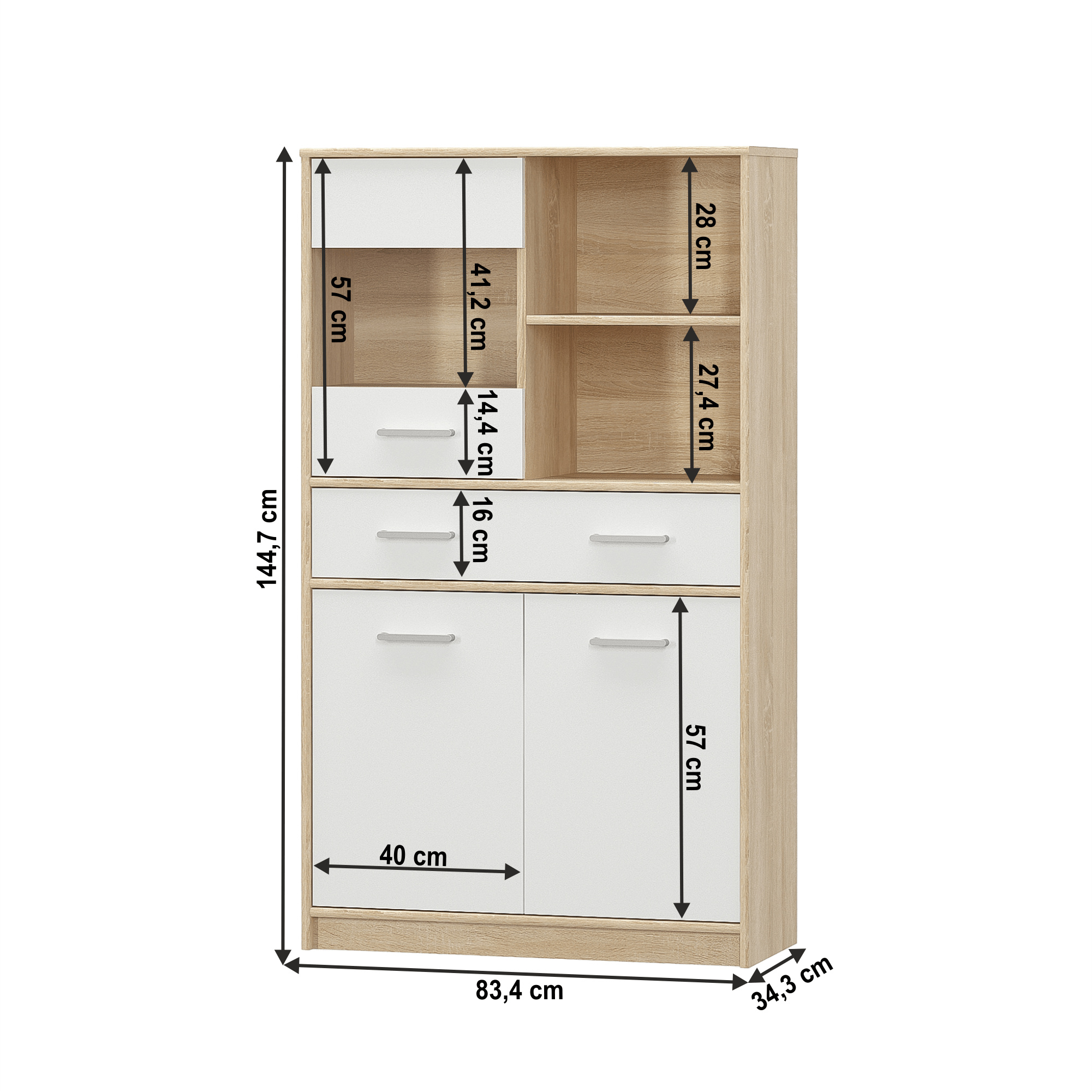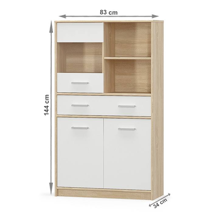 Vitrína 2D1W1S TEYO Materiál: DTD laminovaná Barva: bílá / dub sonoma Rozměry (ŠxHxV): 83,4x34,3x144,7 cm Tloušťka materiálu: 16 mm Dodávané v demontu.
