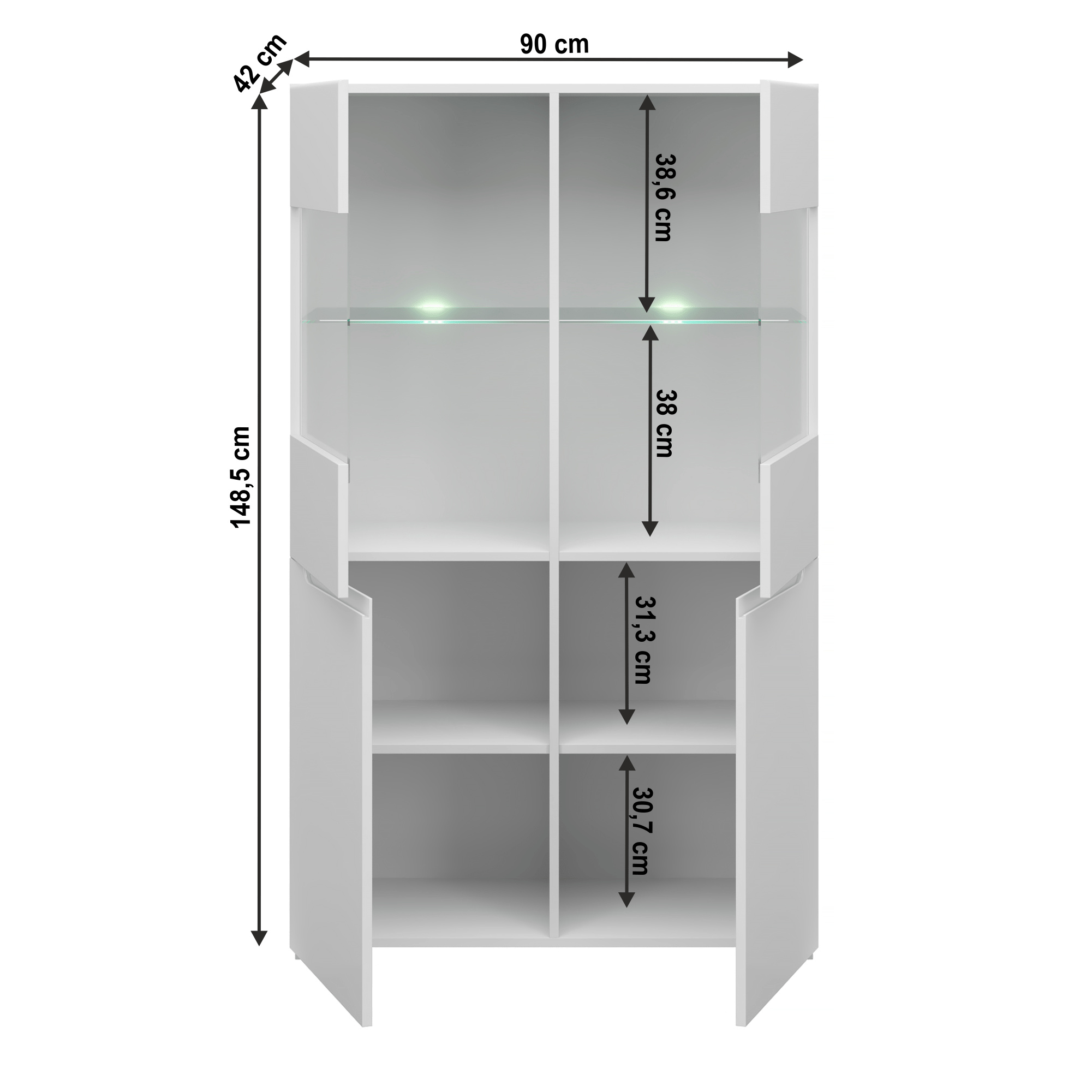 Materiál korpus: DTD laminovaná Barva: bílá Materiál dvířka: MDF Barva: bílý extra vysoký lesk HG Rozměry (ŠxHxV): 90x42x148,5 cm Tloušťka materiálu korpus: 16 cm Tloušťka materiálu dvířka: 18 cm Dodávané bez LED osvětlení moderní styl Dodávané v demontu