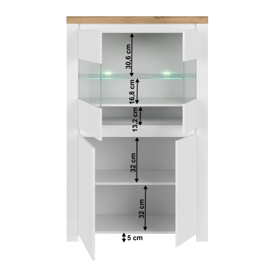 Materiál: DTD laminovaná/ABS hrany Barva: bílý extra vysoký lesk/dub wotan Rozměry(ŠxHxV): 98x41,5x156,5 cm Materiál dvířka: MDF/sklo Výška spodního prostoru od podlahy: 5cm Tloušťka materiálu: 1,6 až 2,2 cm Čtyřdveřová Otevírání/zavírání pomocí výřezu Obsahuje dvířka se sklem a skleněnou polici Dvě skříňky Ve skříňce jsou police Výška spodních polic: 32 cm Výška první horní police: 30,6 cm Výška druhé horní police: 16,8 cm Výška třetí horní police: 13,2 cm Bez úchytek Bez LED osvětlení Možnost dokoupení LED osvětlení Dodávána v demontu