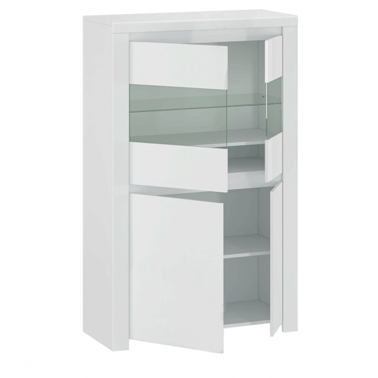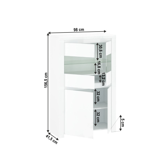 Materiál: laminovaná DTD / MDF Barva: bílý lesk Rozměry (ŠxHxV): 98x41,5x156,5 cm Materiál dvířka: MDF / sklo Tloušťka materiálu: 1,6 cm ABS hrany čtyřdveřová Obsahuje dvířka se sklem a skleněnou polici bez úchytek Bez LED osvětlení Možnost dokoupení LED osvětlení Moderní design a elegantní vzhled Dodávané v demontu