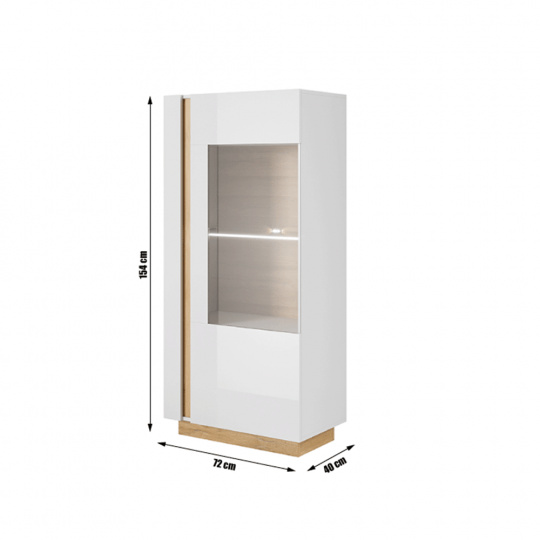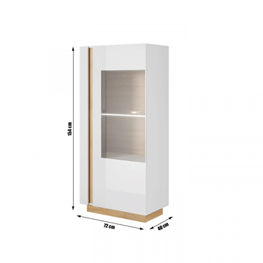Materiál: DTD laminovaná / ABS hrany Barva: bílá / dub grandson / bílý lesk Rozměry (ŠxHxV): 72x40x154 cm Tloušťka materiálu: 16 mm bez úchytek S 3 policemi Nosnost skleněné police: max 3 kg Dodávané v demontu