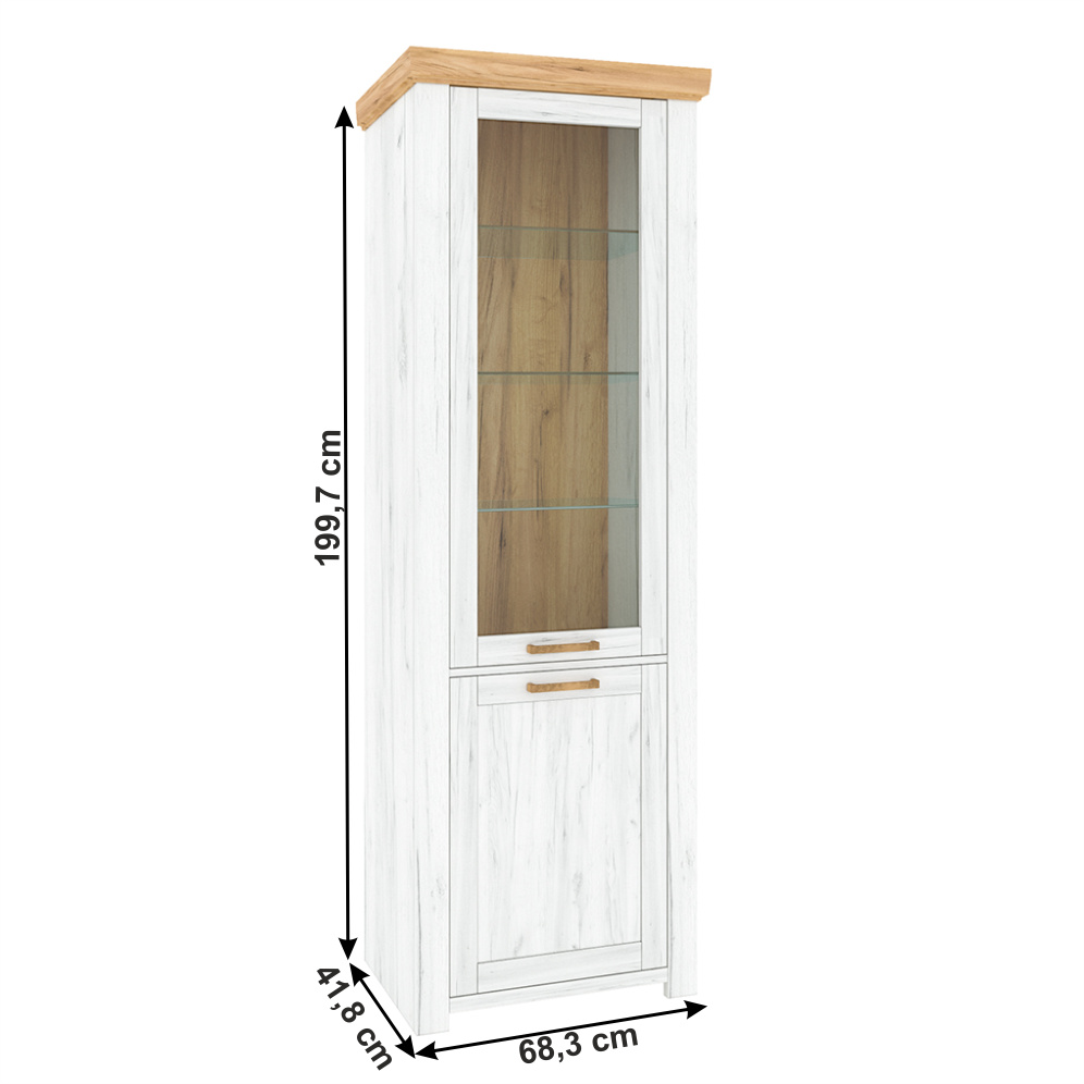 Materiál: DTD laminovaná / MDF laminovaná Barva: dub craft zlatý / dub craft bílý Rozměry (ŠxHxV): 68,3x41,8x199,7 cm Tloušťka materiálu korpus: 16 mm Tloušťka materiálu vrchní deska: 22 mm Tloušťka materiálu dvířka: 19 mm Výška spodního prostoru od podlahy je 4,2 cm dvoudveřová Jedny plná dvířka Jedny prosklené dvířka Dodávané v demontu