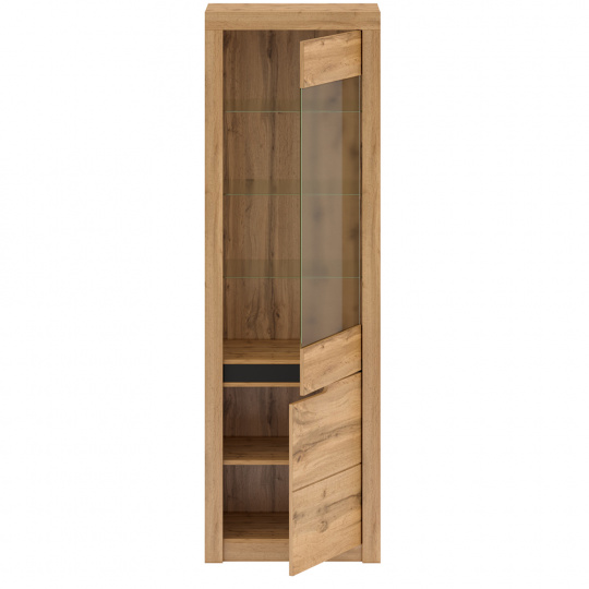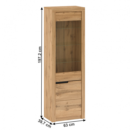 Materiál: DTD laminovaná / MDF fóliovaná Barva: dub Wotan Rozměry (ŠxHxV): 63x39,7x197,2 cm Tloušťka materiálu korpus: 16 mm Tloušťka materiálu dvířka: 19 mm dvě skříňky prosklená S policemi pravé provedení Dodávané v demontu.