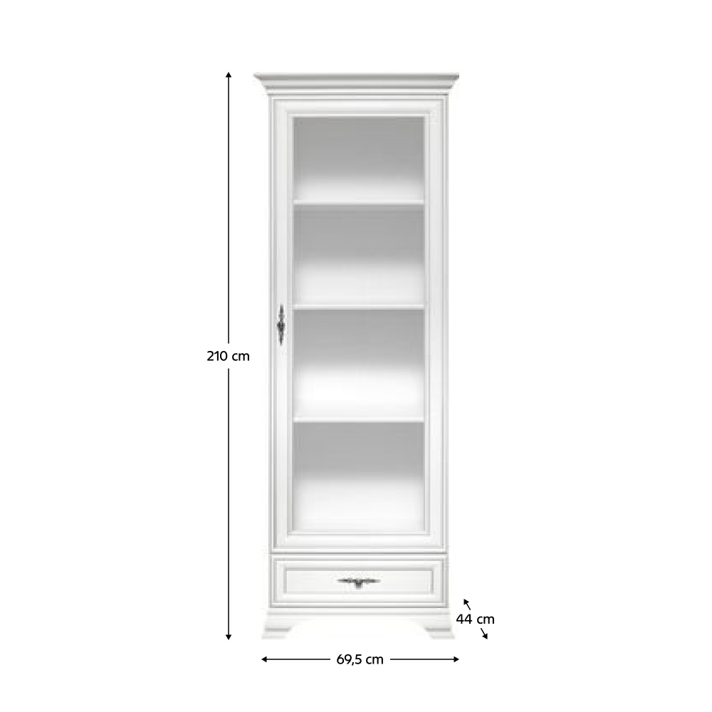 Materiál: DTD laminovaná/sklo Barva: alpská bílá Rozměry (ŠxHxV): 69,5x44x210 cm Tloušťka materiálu: 1,6 cm Kovové úchytky Barva úchytek: antické stříbro Šuplík Nosnost šuplíku: 3 kg Obsahuje dvířka se sklem Policová Nosnost police: 4 kg Na nožičkách Výška nožiček: 8 cm Doporučujeme připevnit ke stěně Dodáváno v demontu