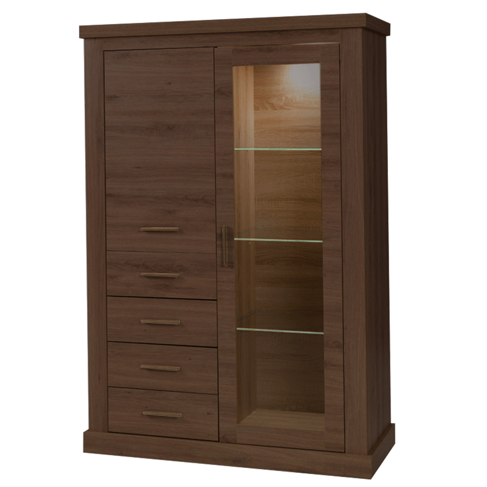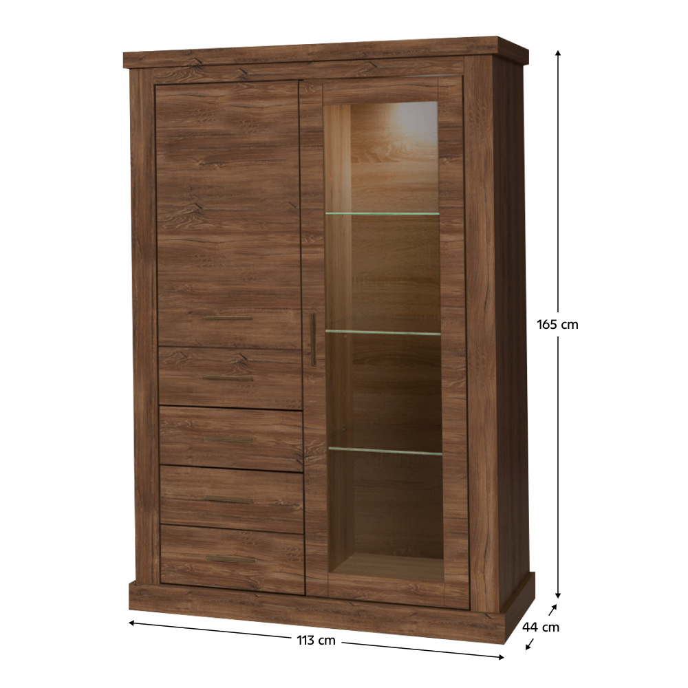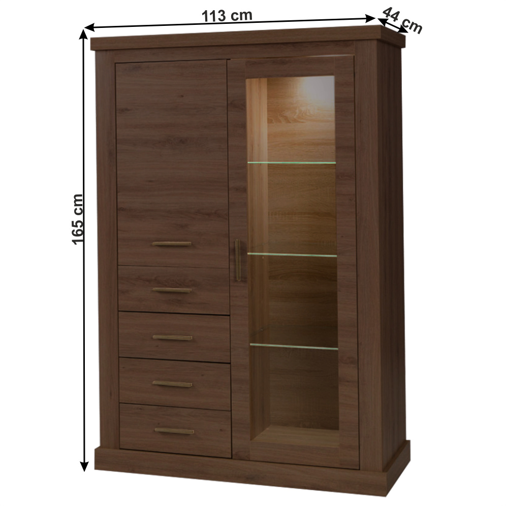 Materiál: DTD laminovaná / ABS hrany Barva: dub stirling Rozměry (ŠxHxV): 113x44x165 cm Tloušťka materiálu: 50 mm 3D efekt kovové úchytky ABS hrany čtyři šuplíky police skříňka Dodávané bez LED osvětlení Dodávané v demontu