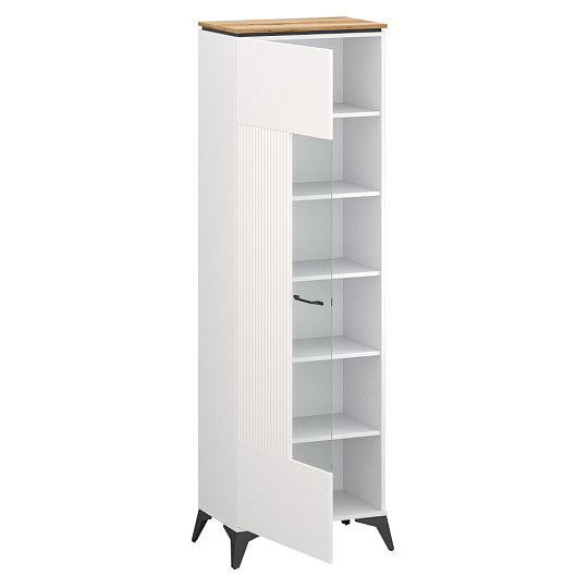 Materiál: laminovaná DTD/fóliovaná MDF/PVC Barva: bílá/dub evoke Rozměry (ŠxHxV): 67,1x43,5x203,2 cm Tloušťka materiálu: 1,6 cm Jednodveřová Skleněná výplň Dvířka jsou univerzální Možnost namontovat dvířka na pravou nebo na levou stranu Policová Nosnost police: 3 kg Kovové úchytky Barva úchytek: černá Kovové nožičky Barva nožiček: černá Výška nožiček: 14,5 cm Dekorativní rýhovaná dvířka Moderní design Bez LED osvětlení Možnost dokoupení LED osvětlení Doporučujeme připevnit ke zdi Dodáváno v demontu