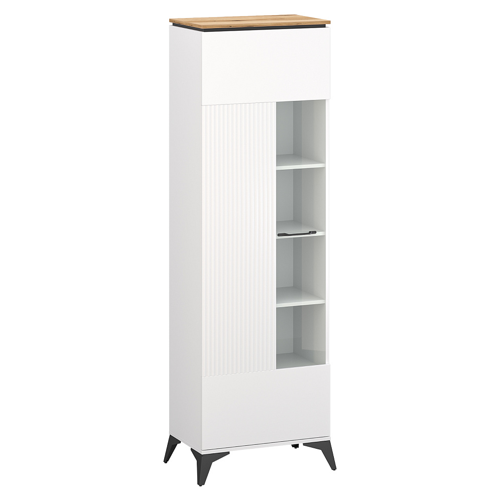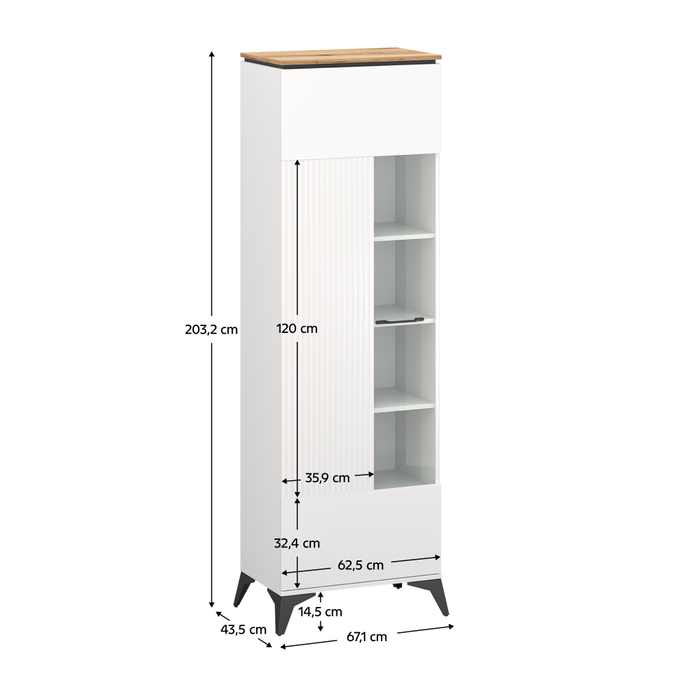 Materiál: laminovaná DTD/fóliovaná MDF/PVC Barva: bílá/dub evoke Rozměry (ŠxHxV): 67,1x43,5x203,2 cm Tloušťka materiálu: 1,6 cm Jednodveřová Skleněná výplň Dvířka jsou univerzální Možnost namontovat dvířka na pravou nebo na levou stranu Policová Nosnost police: 3 kg Kovové úchytky Barva úchytek: černá Kovové nožičky Barva nožiček: černá Výška nožiček: 14,5 cm Dekorativní rýhovaná dvířka Moderní design Bez LED osvětlení Možnost dokoupení LED osvětlení Doporučujeme připevnit ke zdi Dodáváno v demontu