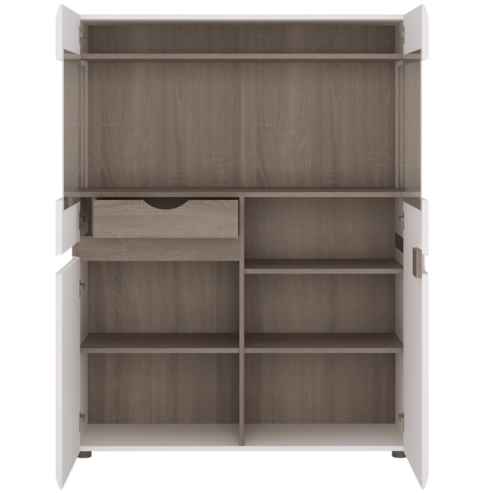 Vitrína 3dveřová se šuplíkem, LYNATET 33 Materiál: laminovaná DTD/fóliovaná MDF/sklo Barva: dub sonoma truflový/bílá s extra vysokým leskem Rozměry (ŠxHxV): 109,5x42x143 cm Nosnost polic ve skříňkách: 5 kg Nosnost spodní police: 20 kg Tloušťka materiálu: 16 mm Třídveřová Korpus je v matném provedení Dvířka jsou v provedení extra vysoký lesk Se šuplíkem Dodáváno v demontu