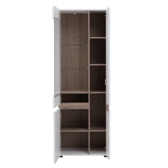 Vitrína 3dveřová, LYNATET 01 Materiál: laminovaná DTD/fóliovaná MDF/sklo Barva: dub sonoma truflový/bílá s extra vysokým leskem Rozměry (ŠxHxV): 64x42x194,5 cm Nosnost skleněných polic: 3 kg Nosnost polic ve skříňkách: 5 kg Nosnost spodní police: 30 kg Tloušťka materiálu: 16 mm Třídveřová Levé provedení Korpus je v matném provedení Dvířka jsou v provedení extra vysoký lesk Dodáváno v demontu