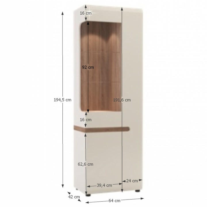 Vitrína 3dveřová, LYNATET 01 Materiál: laminovaná DTD/fóliovaná MDF/sklo Barva: dub sonoma truflový/bílá s extra vysokým leskem Rozměry (ŠxHxV): 64x42x194,5 cm Nosnost skleněných polic: 3 kg Nosnost polic ve skříňkách: 5 kg Nosnost spodní police: 30 kg Tloušťka materiálu: 16 mm Třídveřová Levé provedení Korpus je v matném provedení Dvířka jsou v provedení extra vysoký lesk Dodáváno v demontu