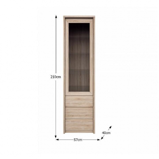 Vitrína s šuplíkem 1W3S NORTY TYP 4 Materiál: DTD laminovaná Provedení: dub sonoma Rozměry (ŠxHxV): 57x40x210 cm Tloušťka materiálu: 32 mm Tloušťka materiálu zbývající části: 16 mm Dodávané v demontu.