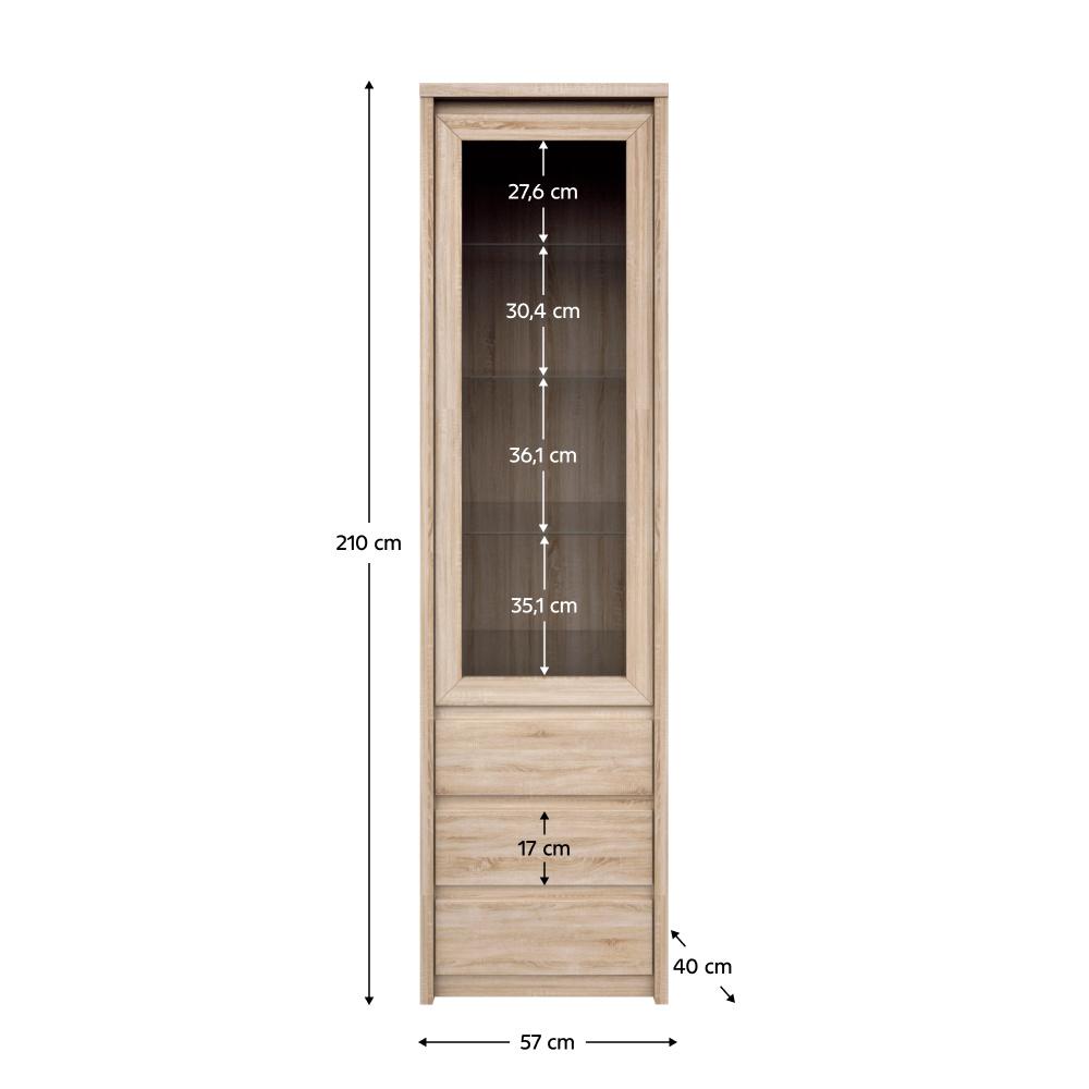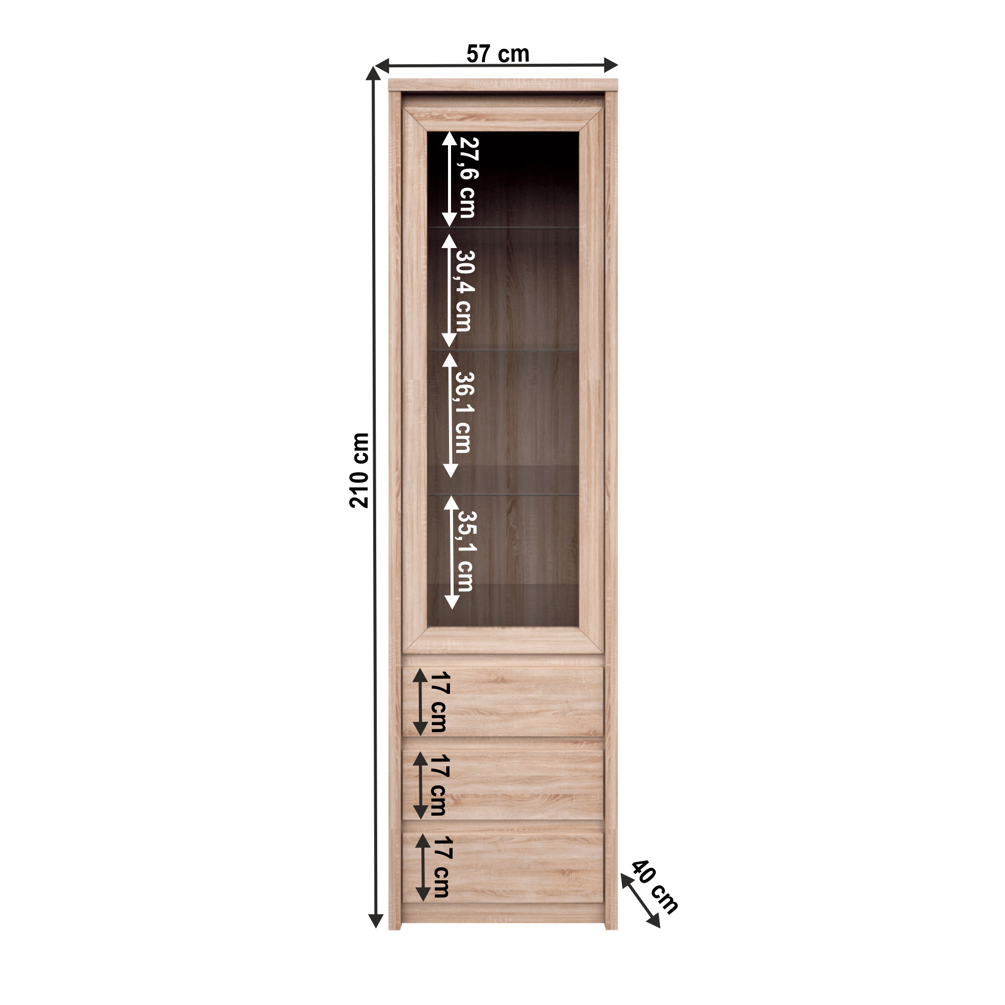 Vitrína s šuplíkem 1W3S NORTY TYP 4 Materiál: DTD laminovaná Provedení: dub sonoma Rozměry (ŠxHxV): 57x40x210 cm Tloušťka materiálu: 32 mm Tloušťka materiálu zbývající části: 16 mm Dodávané v demontu.