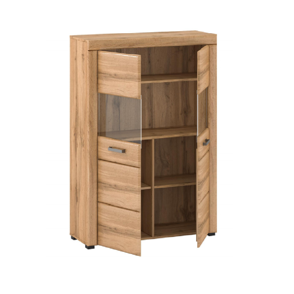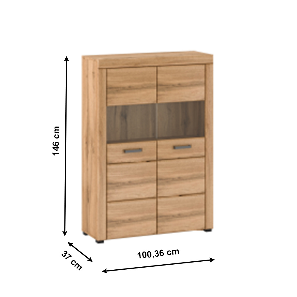 Materiál: laminovaná DTD / MDF fóliovaná / sklo / kov Barevné provedení: dub apalačský Rozměry (ŠxHxV): 100,36x37x146 cm Tloušťka materiálu: 1,9 cm S kovovými úchyty dvoudveřová Přední část s průhledným sklem Police uvnitř vitríny Množství úložného prostoru Dodávané bez led osvětlení Možnost dokoupení LED osvětlení elegantní nožičky Nosnost plné police: 5 kg Nosnost skleněné police: 2 kg Výška spodního prostoru od podlahy: 2,5 cm Moderní retro styl kvalitní zpracování Dodávané v demontu