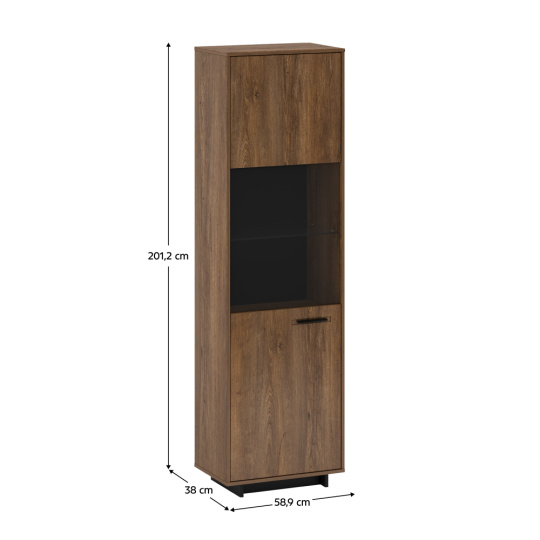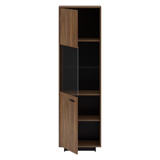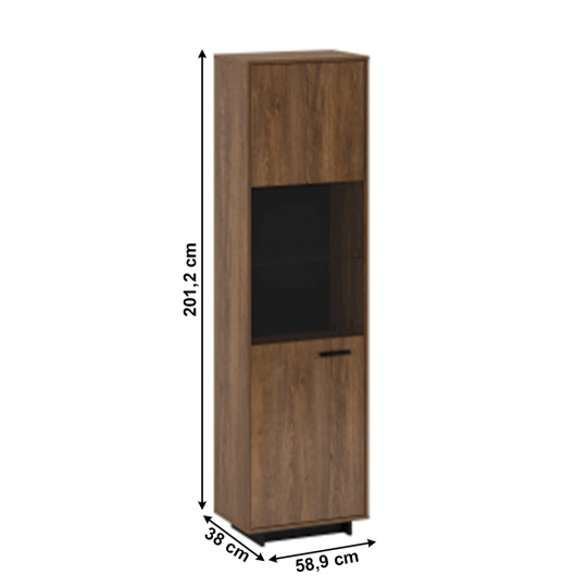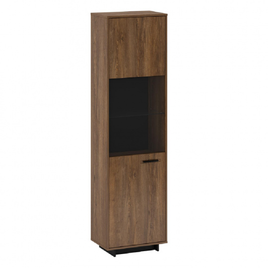 Materiál: DTD laminovaná / MDF fóliovaná/ sklo Barva: dub bolzano / černá Rozměry (ŠxHxV): 58,9x38x201,2 cm Tloušťka materiálu: 16 mm jednodveřová Dvířka v kombinaci se sklem policová 3 police z DTD, 1 skleněná police na podstavci Výška spodního prostoru od podlahy: 5 cm kovová úchytka levé provedení Bez LED osvětlení Možnost dokoupit LED osvětlení v bílé barvě originální design Krásná kresba dřeva Do tradičního i moderního interiéru Do obývacího pokoje, pracovny i jídelny Dodávána v demontu