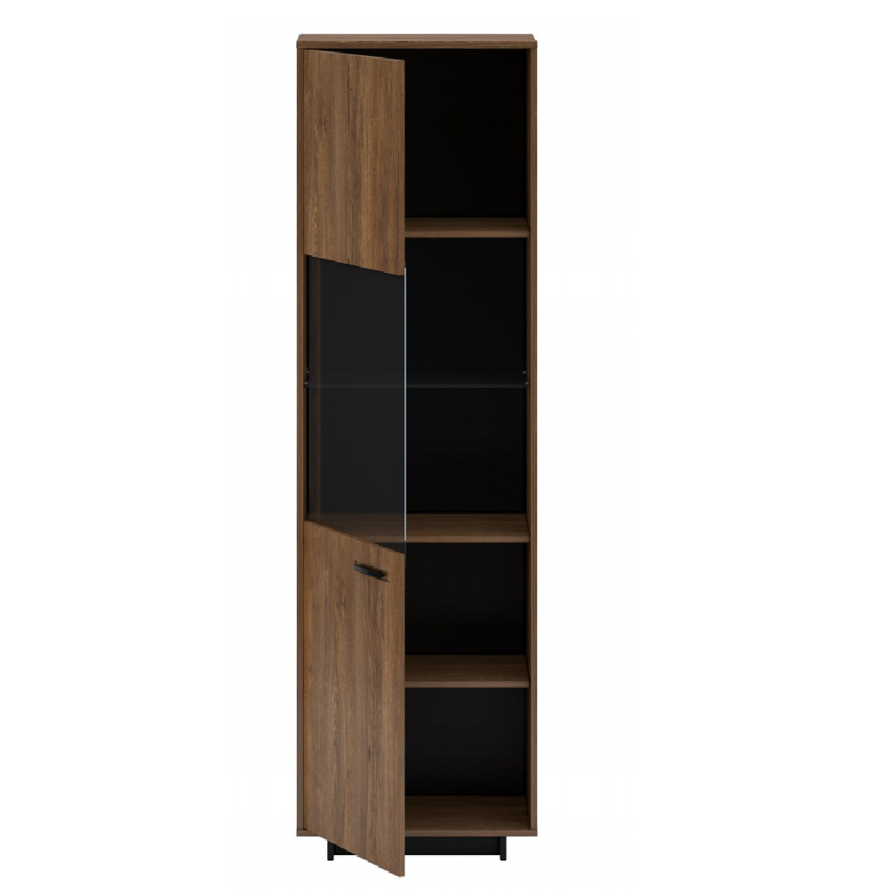 Materiál: DTD laminovaná / MDF fóliovaná/ sklo Barva: dub bolzano / černá Rozměry (ŠxHxV): 58,9x38x201,2 cm Tloušťka materiálu: 16 mm jednodveřová Dvířka v kombinaci se sklem policová 3 police z DTD, 1 skleněná police na podstavci Výška spodního prostoru od podlahy: 5 cm kovová úchytka levé provedení Bez LED osvětlení Možnost dokoupit LED osvětlení v bílé barvě originální design Krásná kresba dřeva Do tradičního i moderního interiéru Do obývacího pokoje, pracovny i jídelny Dodávána v demontu