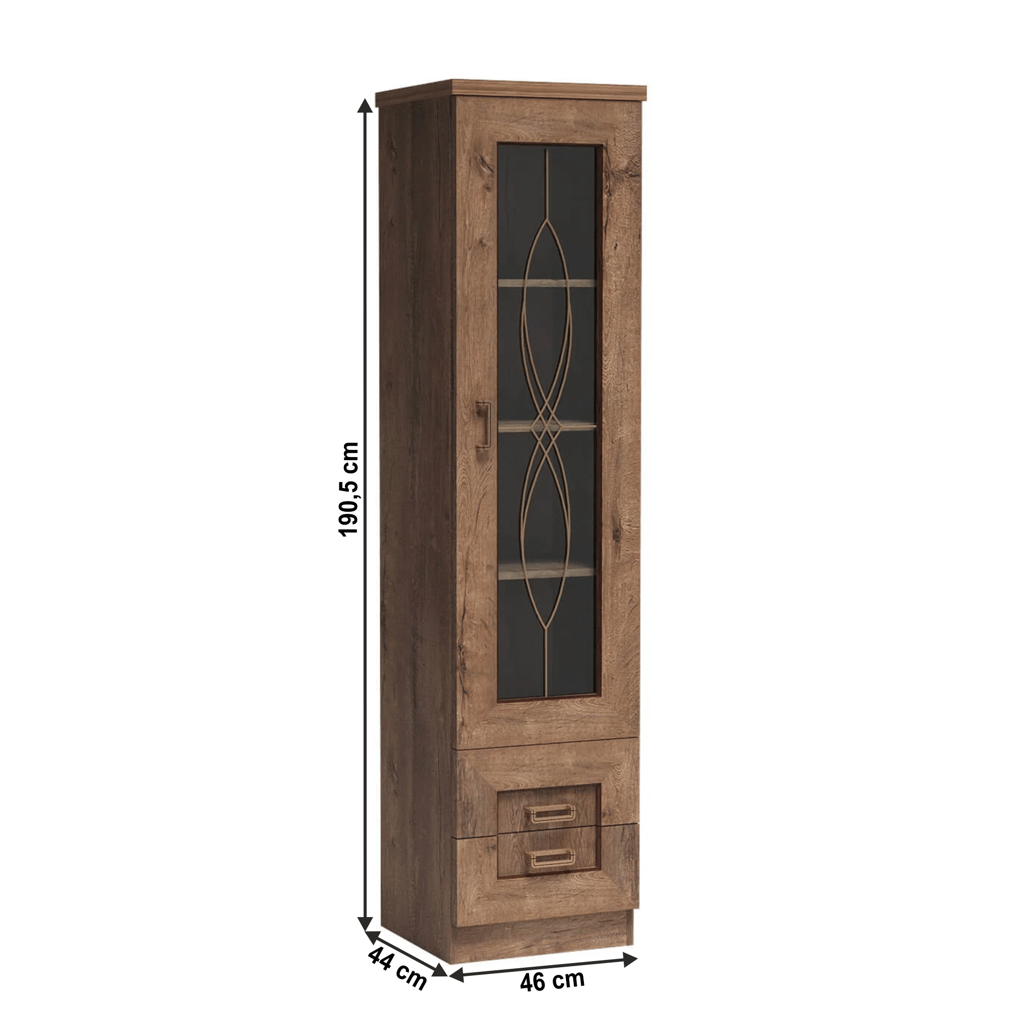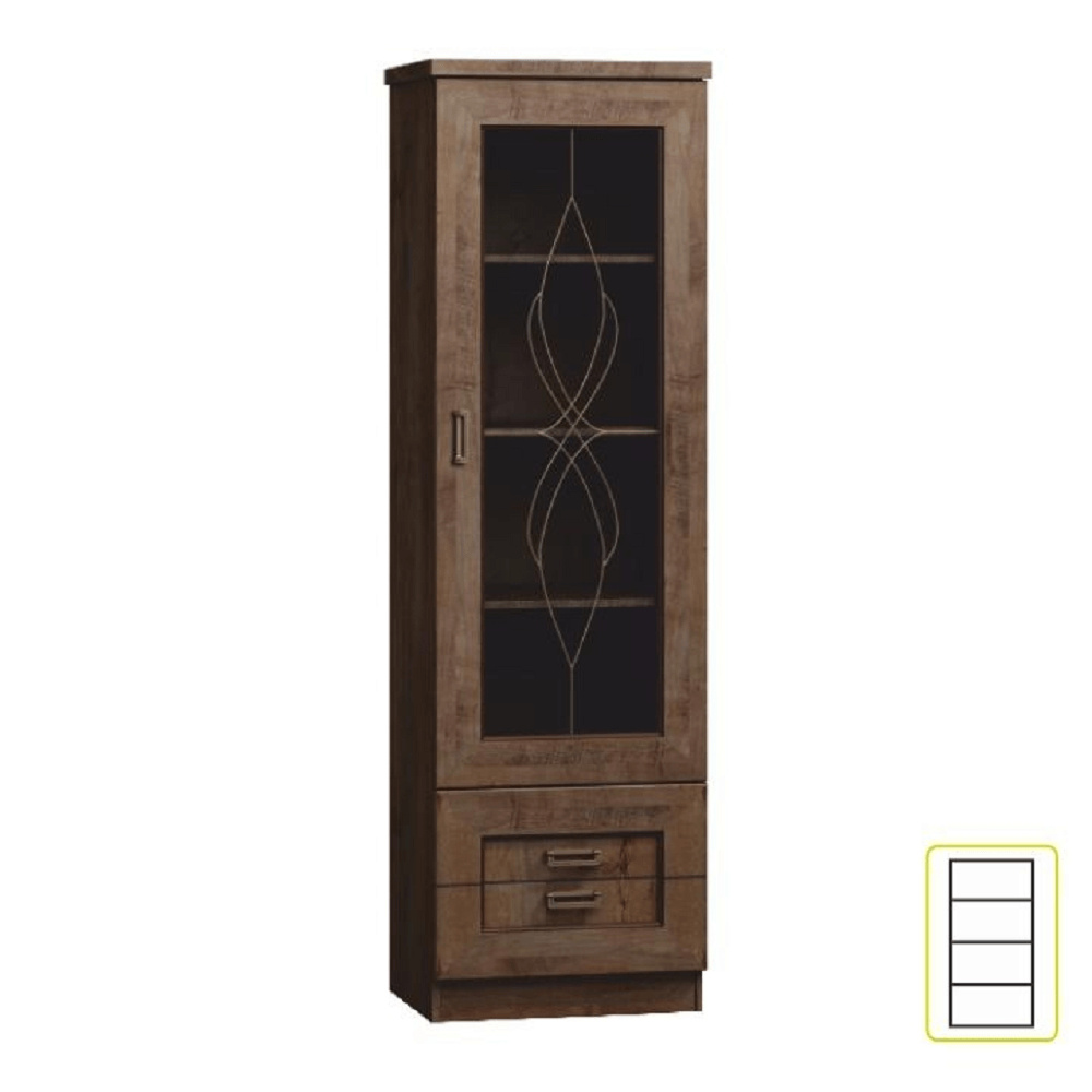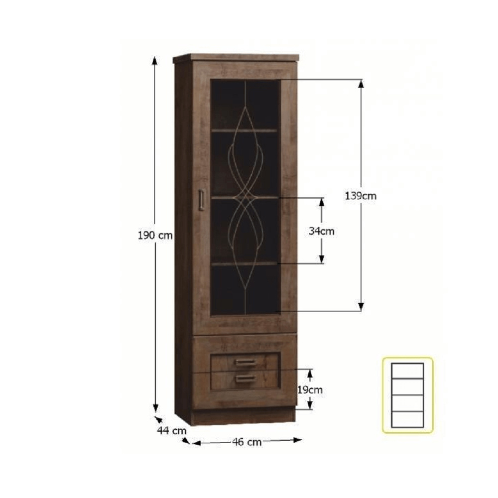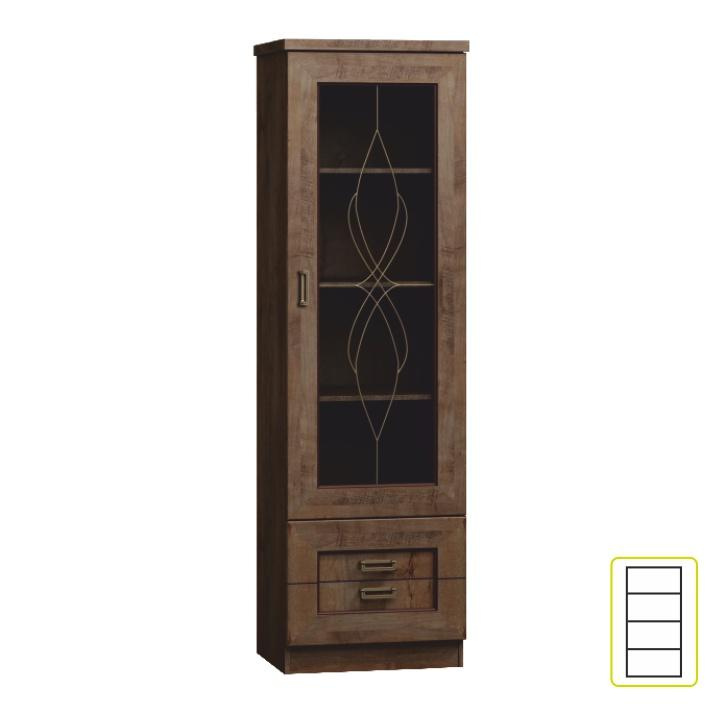 Vitrína TEDY TYP T10 Materiál: laminovaná DTD/fóliovaná MDF/kov/sklo Barva: dub lefkas Rozměry (ŠxHxV): 46x44x190 cm Tloušťka materiálu: 32 mm Tloušťka materiálu zbývající části: 16 mm ABS hrany Rustikální styl Ozdobné lišty Kovové úchyty Vitrína se 3 policemi Prosklená dvířka Dva šuplíky Dodáváno v demontu