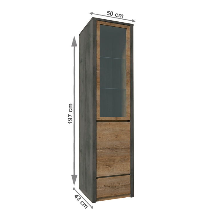 Vitrína W1D, MONTANA Materiál: DTD laminovaná, ABS hrany Barevné provedení: dub lefkas tmavý/smooth šedý Rozměry (ŠxHxV): 50x43x197 cm Tloušťka materiálu: 15 mm Dodávané v demontu.