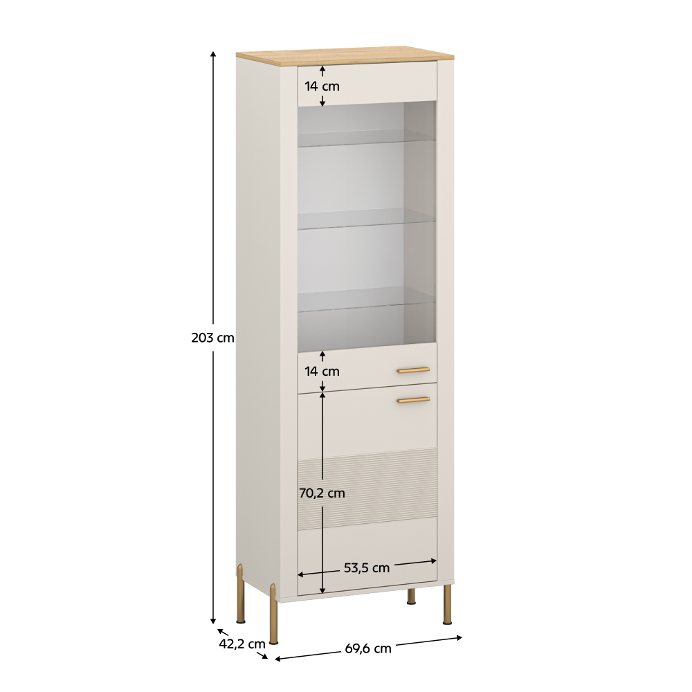 Materiál: DTD laminovaná/fóliovaná MDF/PVC/sklo Barva: kašmír/dub kamenný Rozměry (ŠxHxV): 69,6x42,2x203 cm Tloušťka materiálu: 1,6 cm Dvoudveřová Skříňka s dvířky Skleněná výplň Policová Skleněné police Plné police Nosnost police: 3 kg S úchytkou Materiál úchytky: kov Barva úchytky: zlatá Na nožičkách Materiál nožiček: kov Barva nožiček: zlatá Výška nožiček: 15 cm Dekorativní frézovaná dvířka Moderní design Bez LED osvětlení Možnost dokoupení LED osvětlení z naší nabídky Doporučujeme připevnit ke zdi Dodáváno v demontu