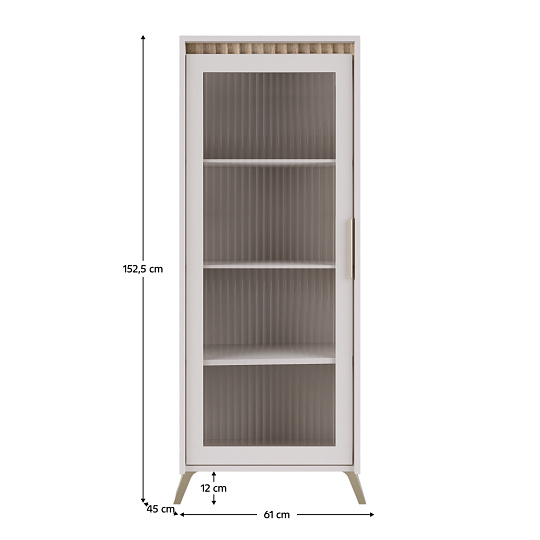 Materiál: laminovaná DTD/fóliovaná MDF/PVC fólie/sklo Barva: kašmír/dub sonoma Rozměry (ŠxHxV): 61x45x152,5 cm Tloušťka materiálu: 1,6-1,9 cm Jednodveřová Dvířka se sklem Tloušťka skla: 0,4 cm Leštěné sklo Kalené sklo Drážkované sklo Průhledné sklo Policová S úchytkou Materiál úchytky: kov Na nožičkách Barva nožiček: přírodní Výška nožiček: 12 cm Panty Hrana : papír impregnovaný termosetovými polymery/PVC Tloušťka materiálu ABS: 0,5 mm Tloušťka dřevovláknité desky zadní strana/dno zásuvky: 0,3 cm Barva zadní strana/dno zásuvky: bílá Dekorativní frézování Moderní design Dodáváno v demontu