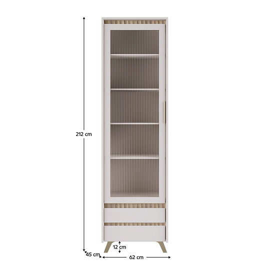 Materiál: laminovaná DTD/fóliovaná MDF/PVC fólie/sklo Barva: kašmír/dub sonoma Rozměry (ŠxHxV): 62x45x212 cm Tloušťka materiálu: 1,6-1,9 cm Jednodveřová Dvířka se sklem Tloušťka skla: 0,4 cm Leštěné sklo Kalené sklo Drážkované sklo Průhledné sklo Policová Dvě zásuvky S úchytkou Materiál úchytky: kov Na nožičkách Barva nožiček: přírodní Výška nožiček: 12 cm Plnovýsuvné kuličkové ložisko Panty Hrana : papír impregnovaný termosetovými polymery/PVC Tloušťka materiálu ABS: 0,5 mm Tloušťka dřevovláknité desky zadní strana/dno zásuvky: 0,3 cm Barva zadní strana/dno zásuvky: bílá Dekorativní frézování Moderní design Dodáváno v demontu