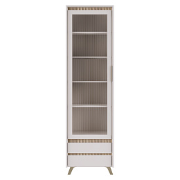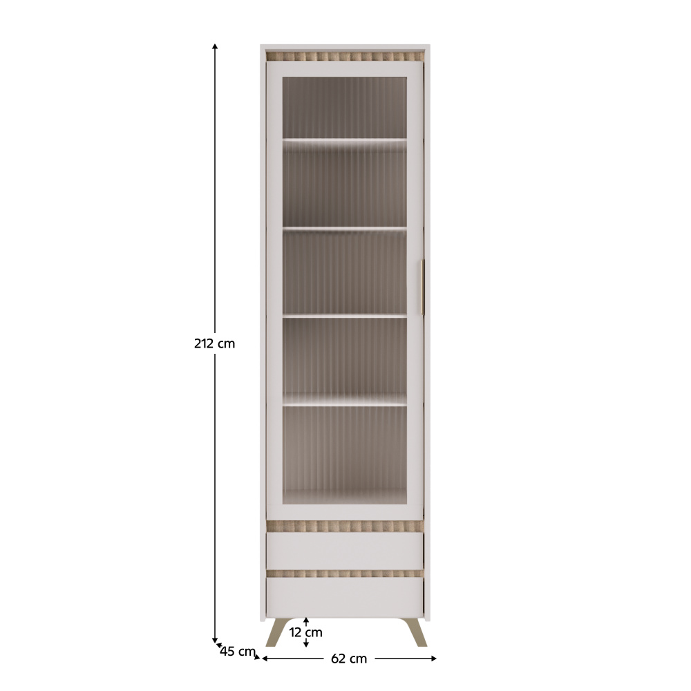 Materiál: laminovaná DTD/fóliovaná MDF/PVC fólie/sklo Barva: kašmír/dub sonoma Rozměry (ŠxHxV): 62x45x212 cm Tloušťka materiálu: 1,6-1,9 cm Jednodveřová Dvířka se sklem Tloušťka skla: 0,4 cm Leštěné sklo Kalené sklo Drážkované sklo Průhledné sklo Policová Dvě zásuvky S úchytkou Materiál úchytky: kov Na nožičkách Barva nožiček: přírodní Výška nožiček: 12 cm Plnovýsuvné kuličkové ložisko Panty Hrana : papír impregnovaný termosetovými polymery/PVC Tloušťka materiálu ABS: 0,5 mm Tloušťka dřevovláknité desky zadní strana/dno zásuvky: 0,3 cm Barva zadní strana/dno zásuvky: bílá Dekorativní frézování Moderní design Dodáváno v demontu