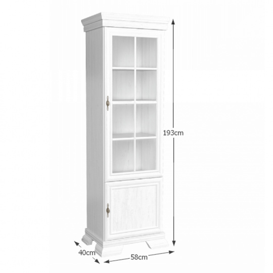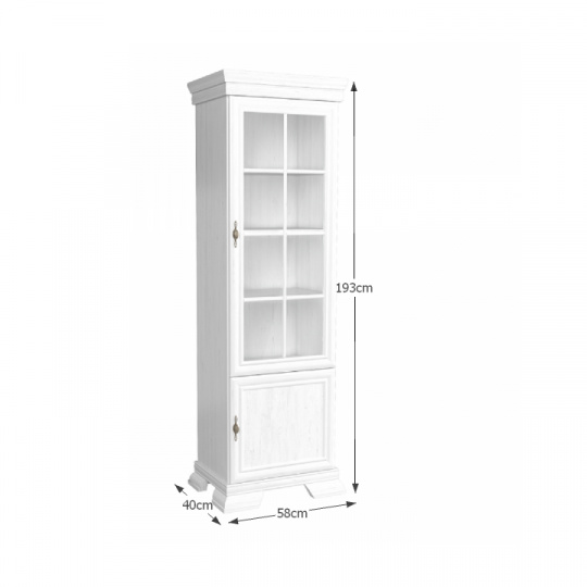 Vitrína KRW1 KORA. Barevné provedení sosna andersen. Materiál laminovaná DTD, MDF, sklo, kov. Rozměry (ŠxHxV): 58x40x193 cm Tloušťka materiálu korpus: 15 mm Tloušťka materiálu vrchní desky: 22 mm Tloušťka materiálu dolní desky: 22 mm Výška spodního prostoru od podlahy: 10,5  cm