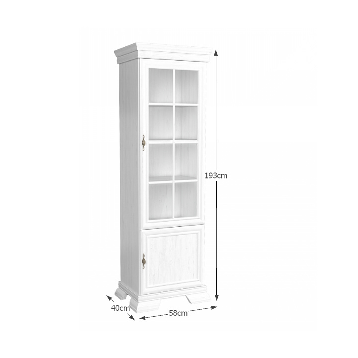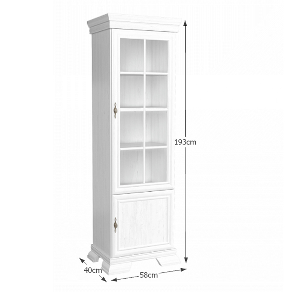 Vitrína KRW1 KORA. Barevné provedení sosna andersen. Materiál laminovaná DTD, MDF, sklo, kov. Rozměry (ŠxHxV): 58x40x193 cm Tloušťka materiálu korpus: 15 mm Tloušťka materiálu vrchní desky: 22 mm Tloušťka materiálu dolní desky: 22 mm Výška spodního prostoru od podlahy: 10,5 cm