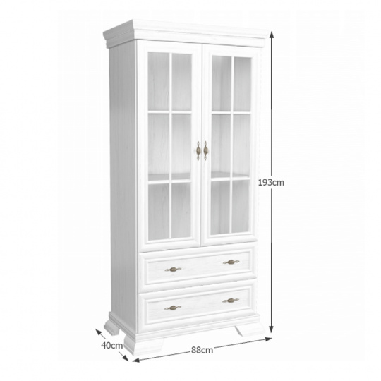 Vitrína KRW2 KORA. Barevné provedení sosna andersen. Materiál laminovaná DTD, MDF, kov, sklo. Rozměry (ŠxHxV): 88x40x193 cm Tloušťka materiálu korpus: 15 mm Tloušťka materiálu vrchní desky: 22 mm Tloušťka materiálu dolní desky: 22 mm Výška spodního prostoru od podlahy: 10,5 cm