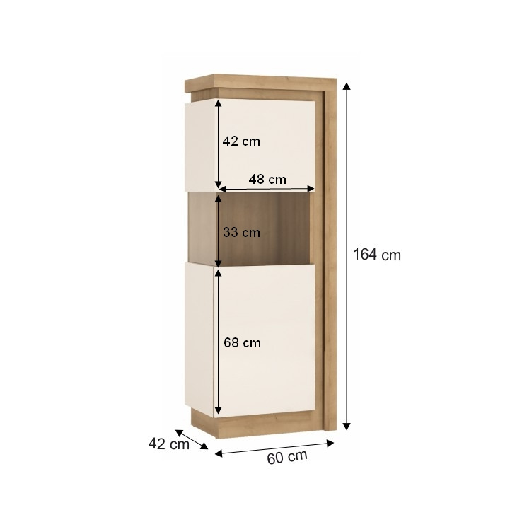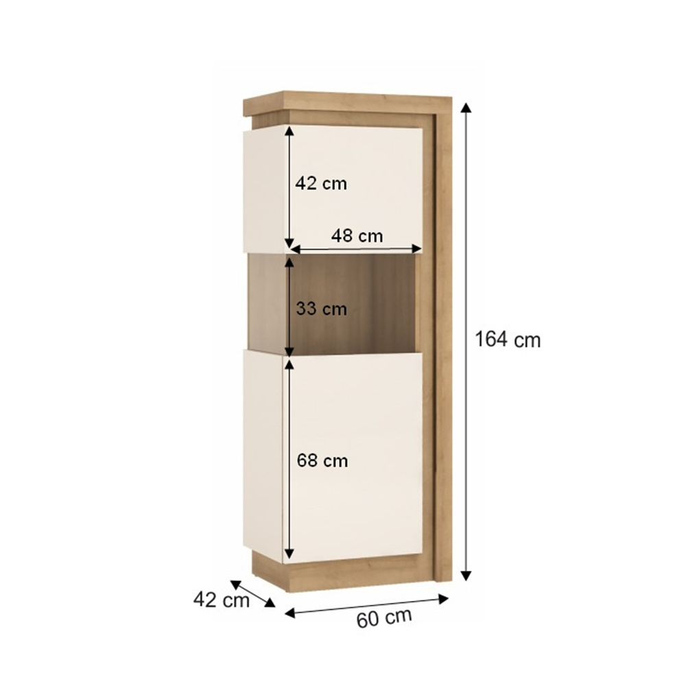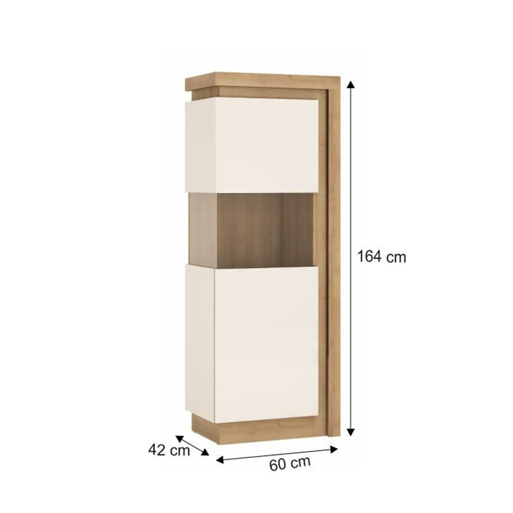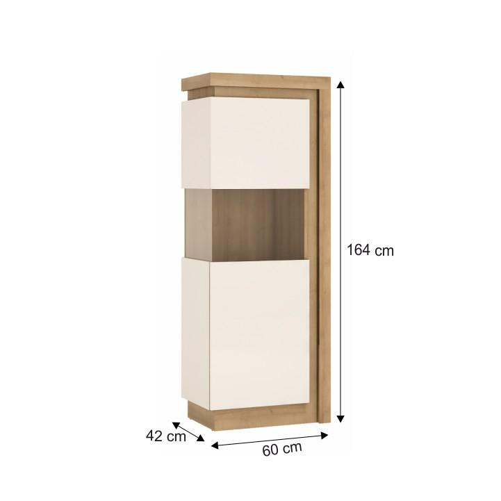 Vitrina LYOV01L ze sektorové sestavy LEONARDO v provedení dub riviera / bílá s extra vysokým leskem Rozměry (ŠxHxV): 60x42x164 cm Tloušťka materálu: 16 mm Systém tichého dorazu dvířek LED osvětlení po obvodu je v ceně Dodávané v demontu