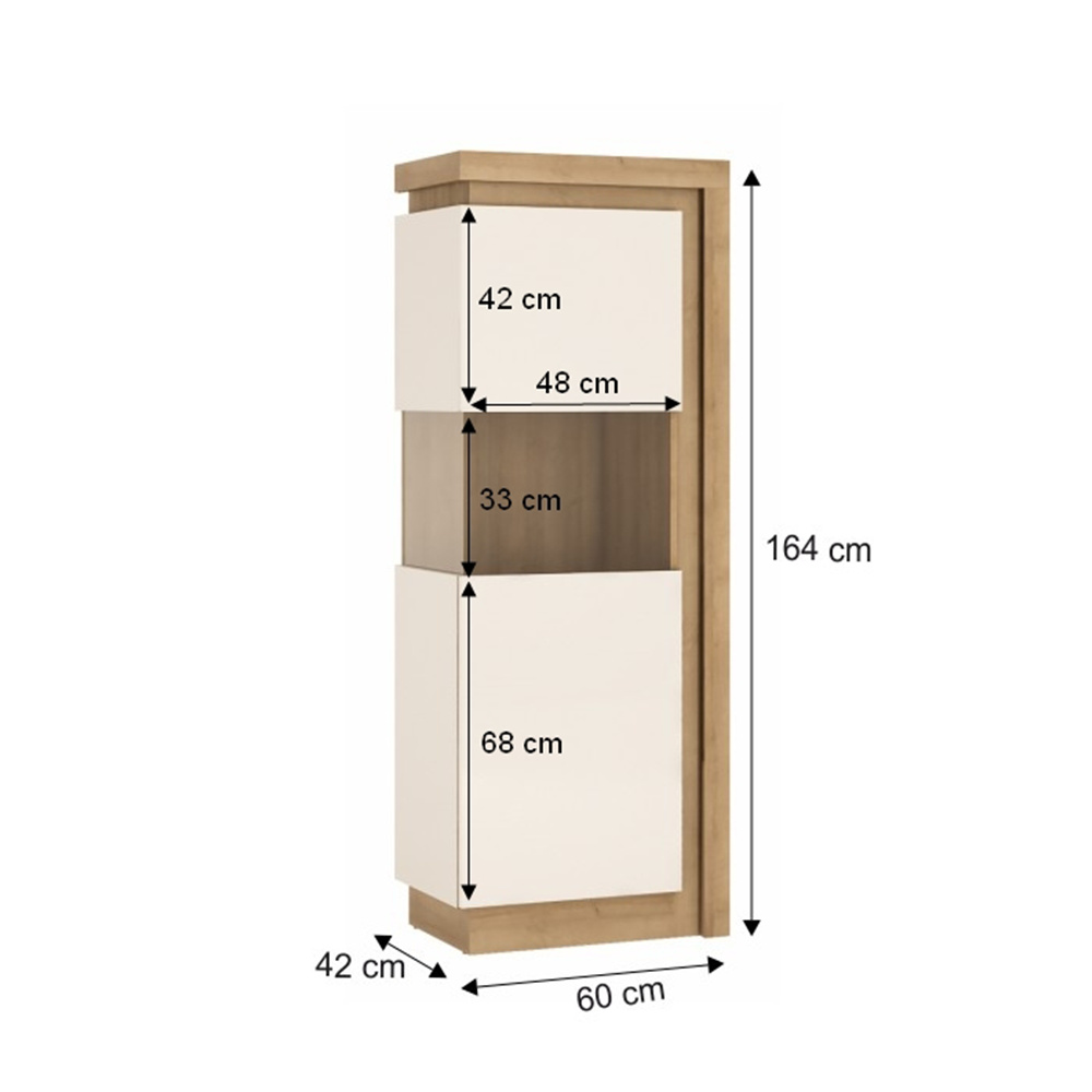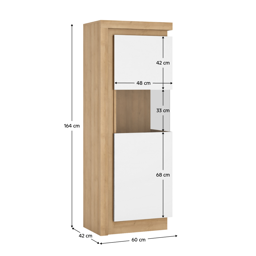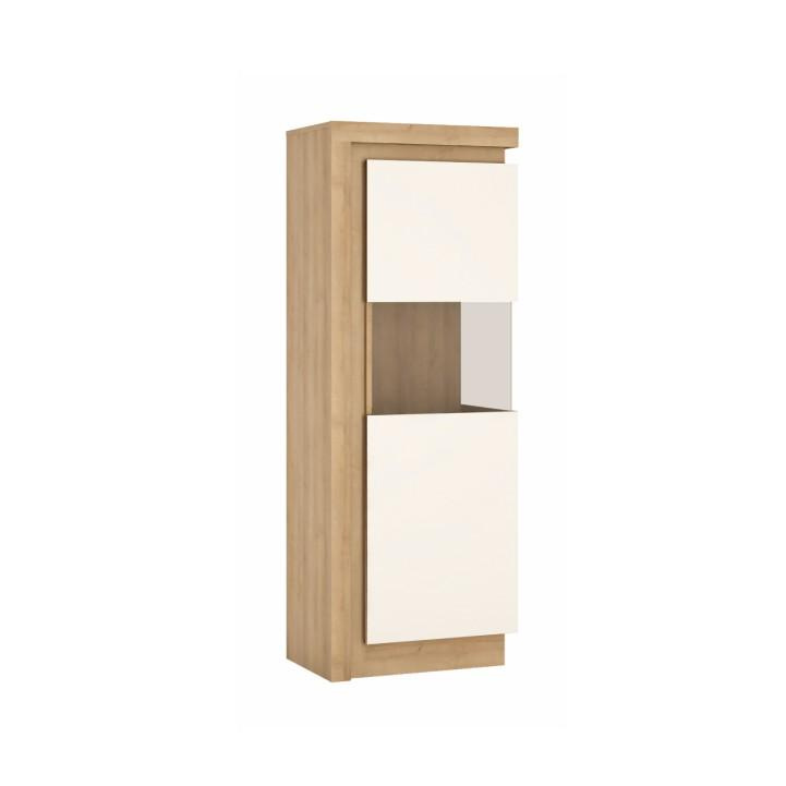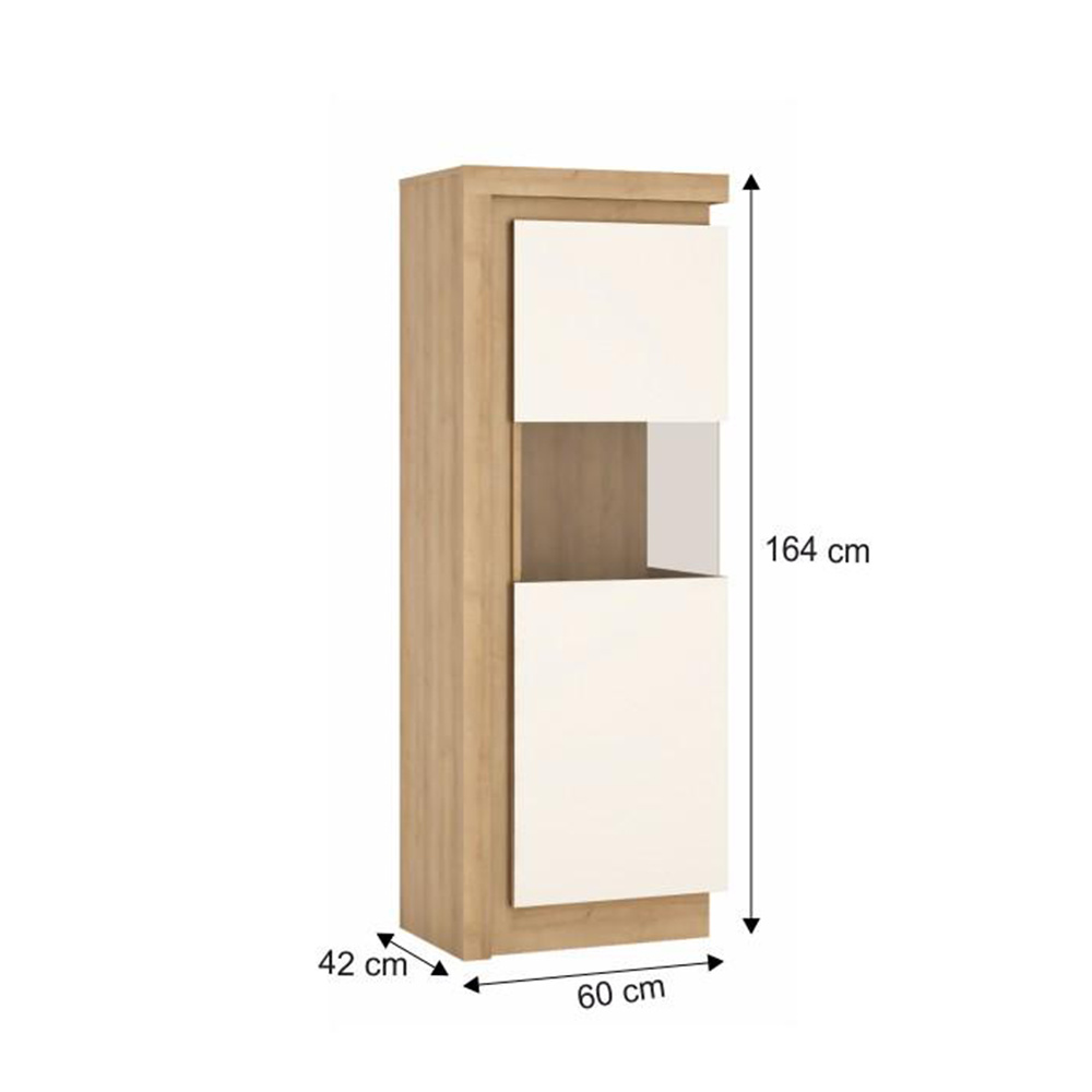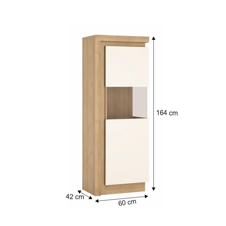 Vitrina LYOV01P ze sektorové sestavy LEONARDO v provedení dub riviera / bílá s extra vysokým leskem Rozměry (ŠxHxV): 60x42x164 cm Tloušťka materálu: 16 mm Systém tichého dorazu dvířek LED osvětlení po obvodu je v ceně Dodávané v demontu