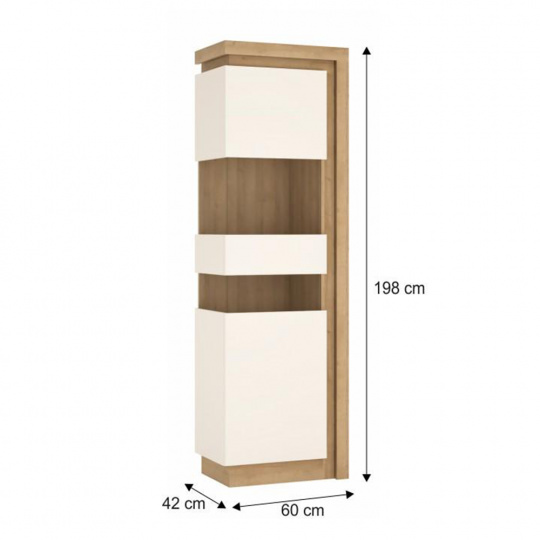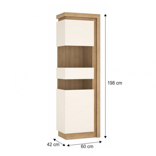 Vitrina LYOV03L ze sektorové sestavy LEONARDO v provedení dub riviera / bílá s extra vysokým leskem Rozměry (ŠxHxV): 60x42x198 cm Tloušťka materálu: 16 mm Systém tichého dorazu dvířek LED osvětlení po obvodu je v ceně Dodávané v demontu