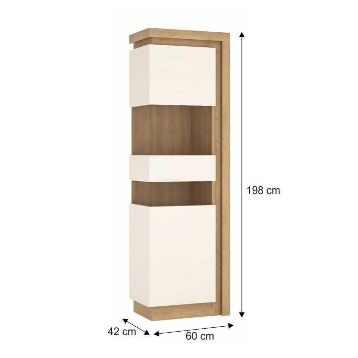 Vitrina LYOV03L ze sektorové sestavy LEONARDO v provedení dub riviera / bílá s extra vysokým leskem Rozměry (ŠxHxV): 60x42x198 cm Tloušťka materálu: 16 mm Systém tichého dorazu dvířek LED osvětlení po obvodu je v ceně Dodávané v demontu